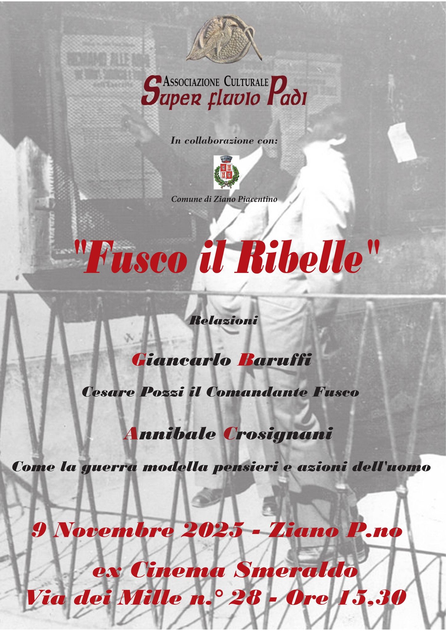Domenica 9 novembre alle ore 15.30, presso l’ex Cinema Smeraldo di Ziano Piacentino, l’Associazione Culturale Super fluvio Padi, in collaborazione con il Comune di Ziano Piacentino, organizza l’incontro “Fusco il Ribelle”, dedicato alla figura di Cesare Pozzi, partigiano e comandante durante la Guerra di Liberazione.