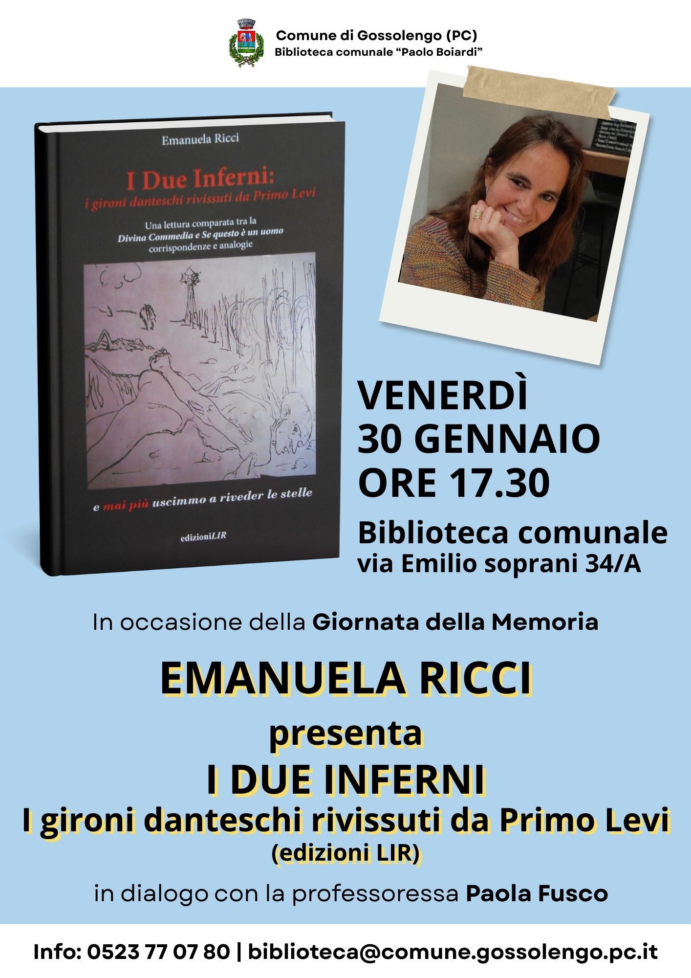 Venerdì 30 gennaio, alle ore 17.30, in occasione della Giornata della Memoria, la Biblioteca comunale “Paolo Boiardi” di Gossolengo ospiterà la presentazione del libro I due inferni. I gironi danteschi rivissuti da Primo Levi di Emanuela Ricci.