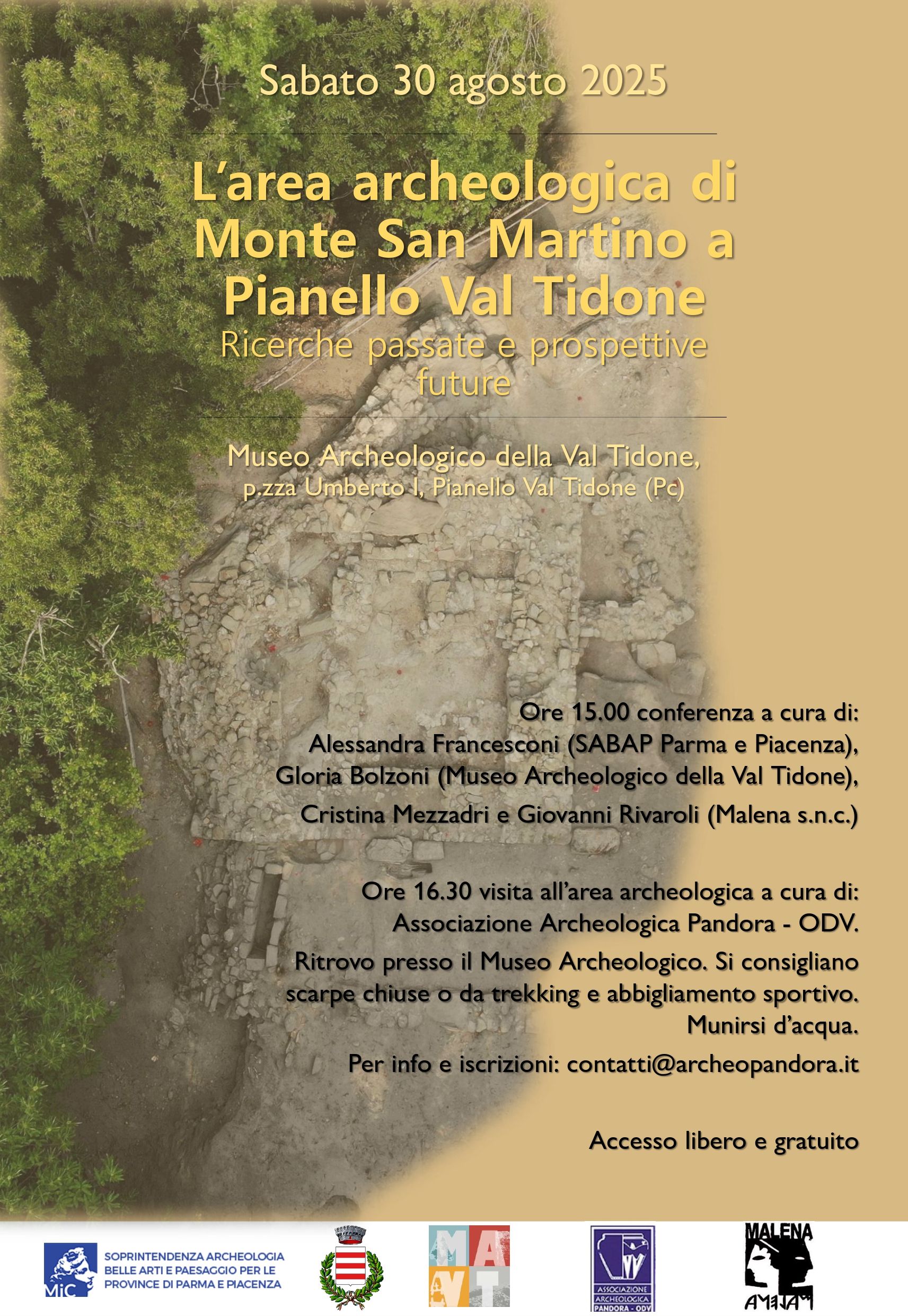 Ore 17.15 circa – Area archeologica di Monte San Martino Visita guidata a cura dell’Associazione Archeologica Pandora – ODV, con la partecipazione degli archeologi del Museo Archeologico della Val Tidone e di Malena snc archeologia.