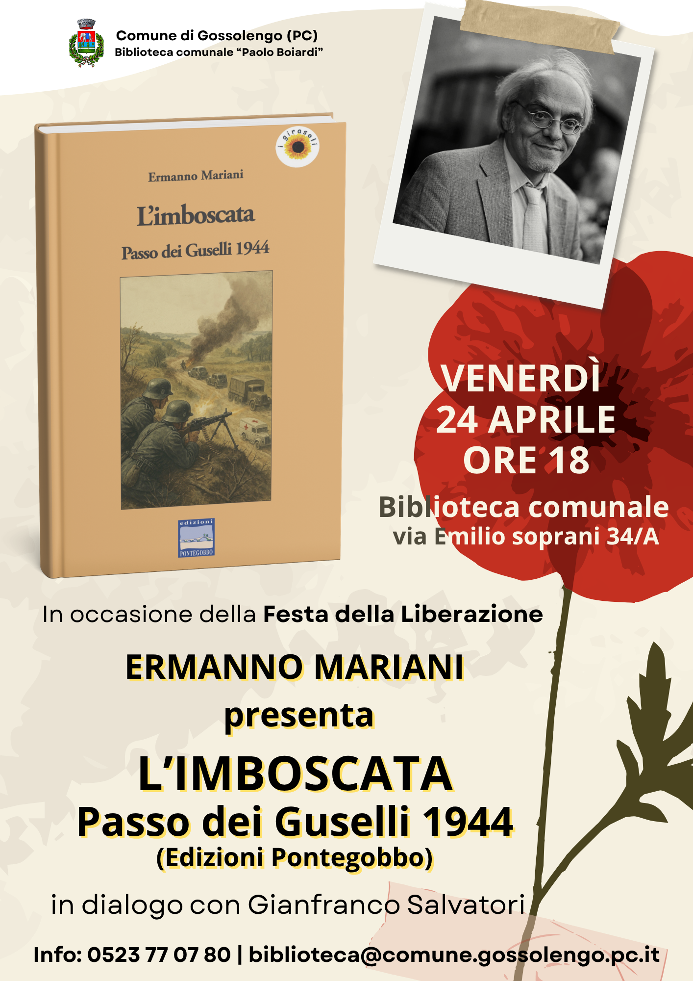 Venerdì 24 aprile alle ore 18.00, la Biblioteca comunale "Paolo Boiardi" di Gossolengo ospita la presentazione del libro "L’imboscata. Passo dei Guselli 1944" di Ermanno Mariani, nell’ambito delle iniziative per la Festa della Liberazione.