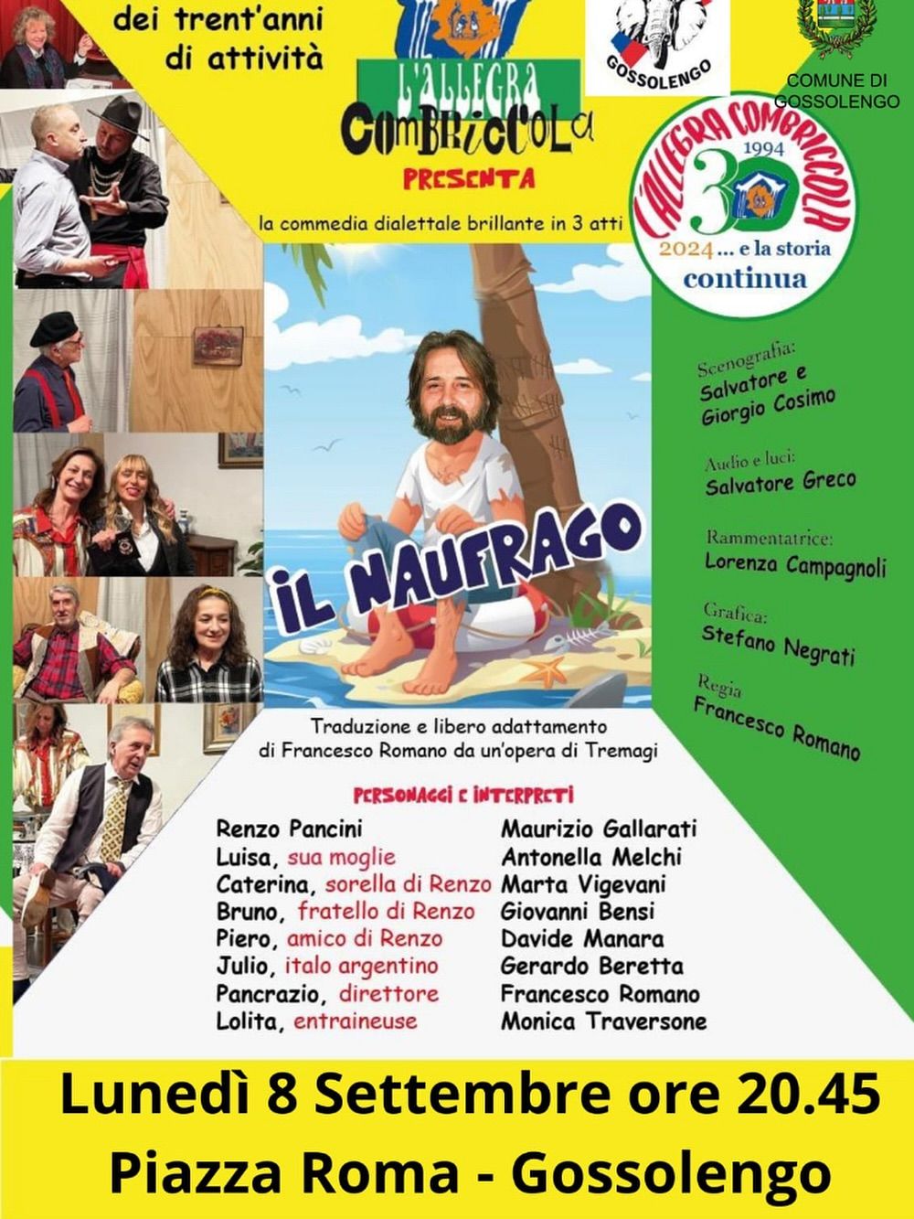 Lunedì 8 settembre alle ore 20.45, in Piazza Roma a Gossolengo, va in scena la commedia dialettale Il naufrago, proposta dalla Compagnia Teatrale L’Allegra Combriccola di Borgonovo.