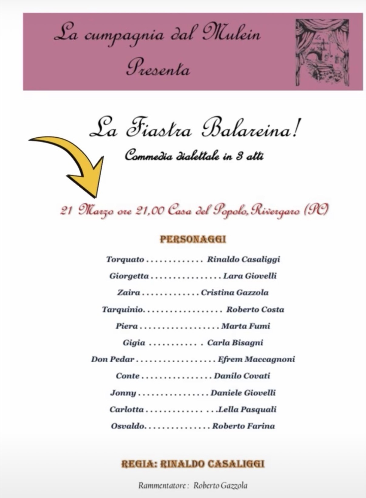 Sabato 21 marzo, alle ore 21.00, la Casa del Popolo di Rivergaro ospita lo spettacolo “La Fiastra Balareina!”, commedia dialettale in tre atti proposta dalla Compagnia dal Mulein.