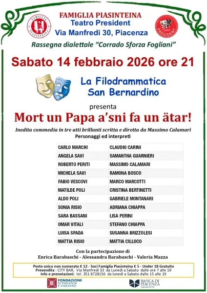 Sabato 14 febbraio, il Teatro President ospita la Filodrammatica San Bernardino con la commedia dialettale “Mort un Papa a’sni fa un ätar!”, nell’ambito della Rassegna dialettale in memoria di Corrado Sforza Fogliani, organizzata dalla Familia Piasinteina.