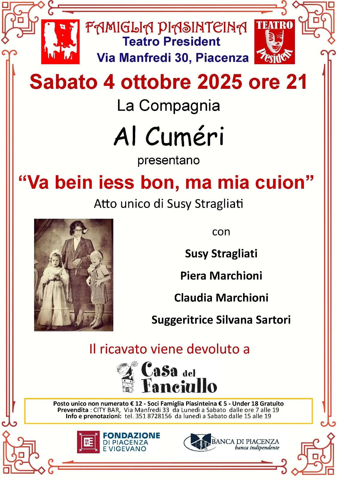 Sabato 4 ottobre, ore 21.00, la Compagnia Al Cuméri porta in scena al Teatro President la commedia “Va bein iess bon, ma mia cuion”, con testo e regia di Susy Stragliati.