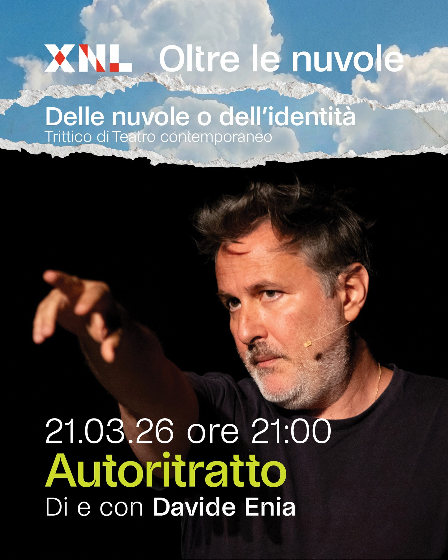 Sabato 21 marzo alle ore 21.00, XNL Piacenza ospita Davide Enia con lo spettacolo "Autoritratto", evento esclusivo inserito nel progetto "Oltre le nuvole", curato da Chiara Gatti, Paola Pedrazzini e Gianmarco Romiti.