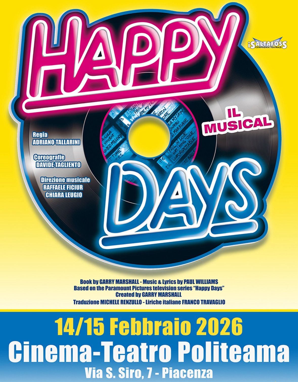 Sabato 14 febbraio alle ore 21.00 e domenica 15 febbraio alle ore 15.30, il Cinema Teatro Politeama ospita Happy Days il Musical, lo spettacolo di culto della Compagnia I Saltafoss, reduce da quattro edizioni consecutive all’insegna del sold out.