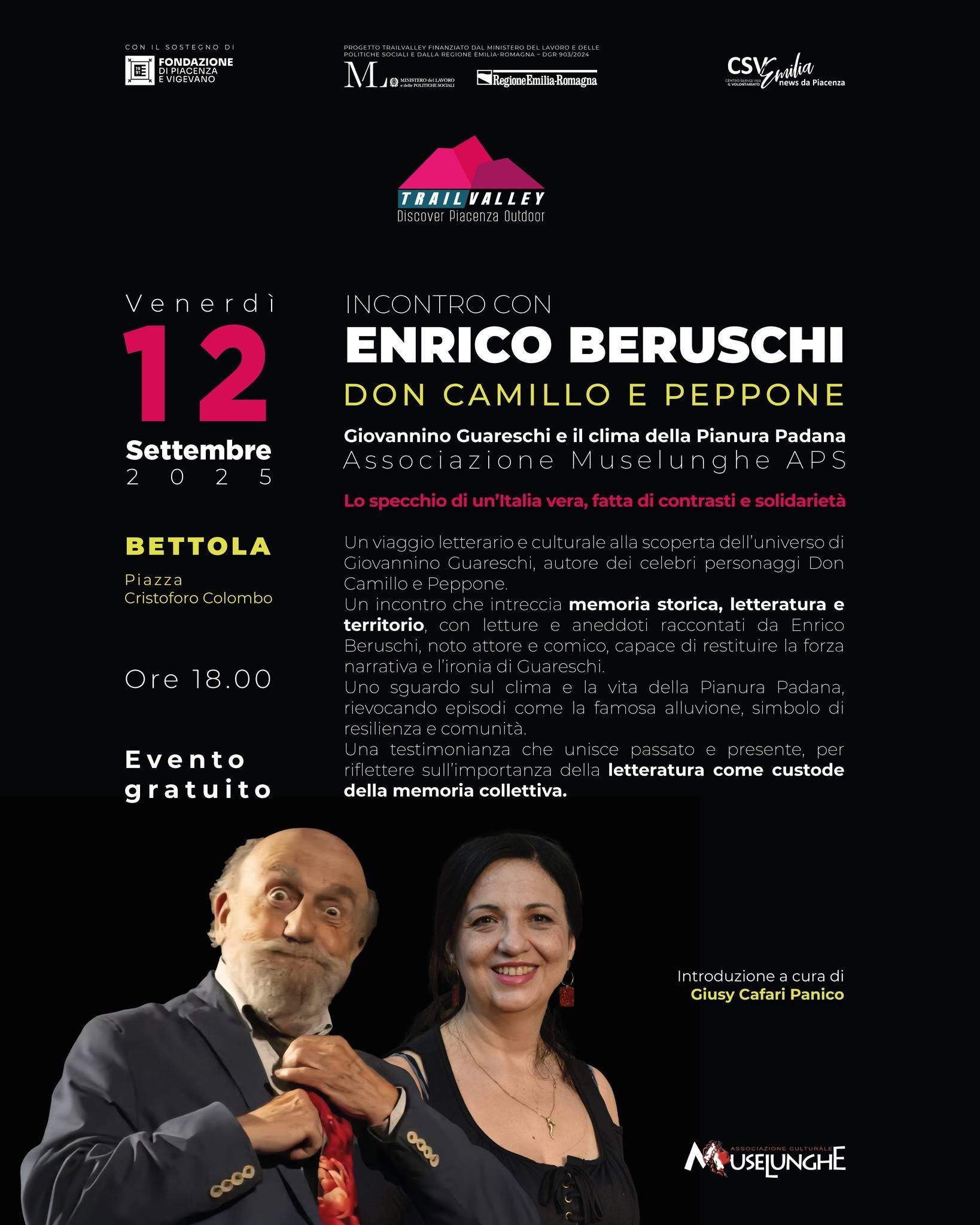 Venerdì 12 settembre, alle ore 18.00, in Piazza Cristoforo Colombo a Bettola, si terrà l’incontro “Don Camillo e Peppone” con Enrico Beruschi, organizzato dall’Associazione Muselunghe APS.