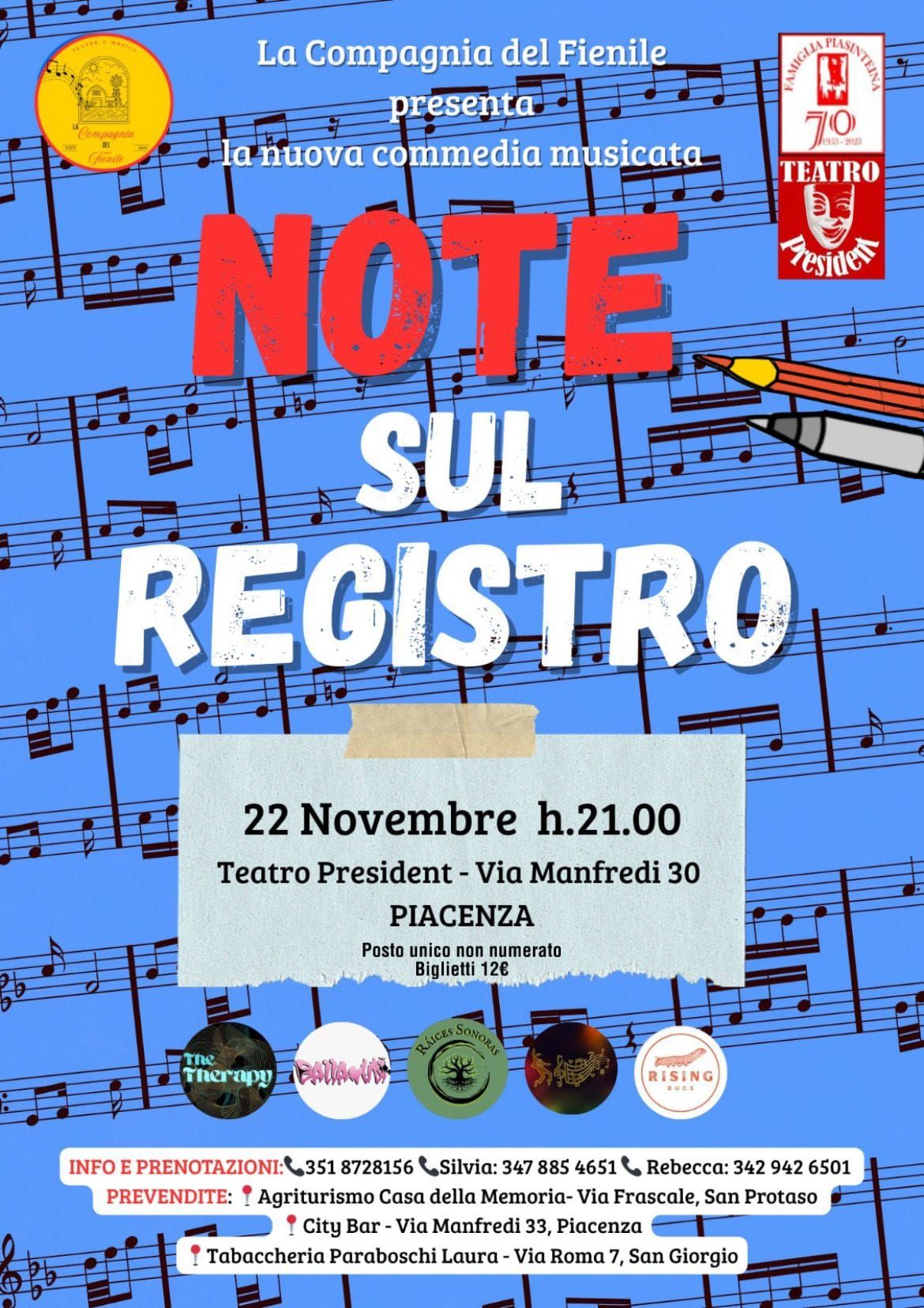 Sabato 22 novembre, alle ore 21.00, il Teatro President ospiterà la commedia musicata “Note sul Registro”, secondo spettacolo della Compagnia del Fienile, giovane gruppo della provincia che unisce musica live e teatro in una formula creativa e originale.