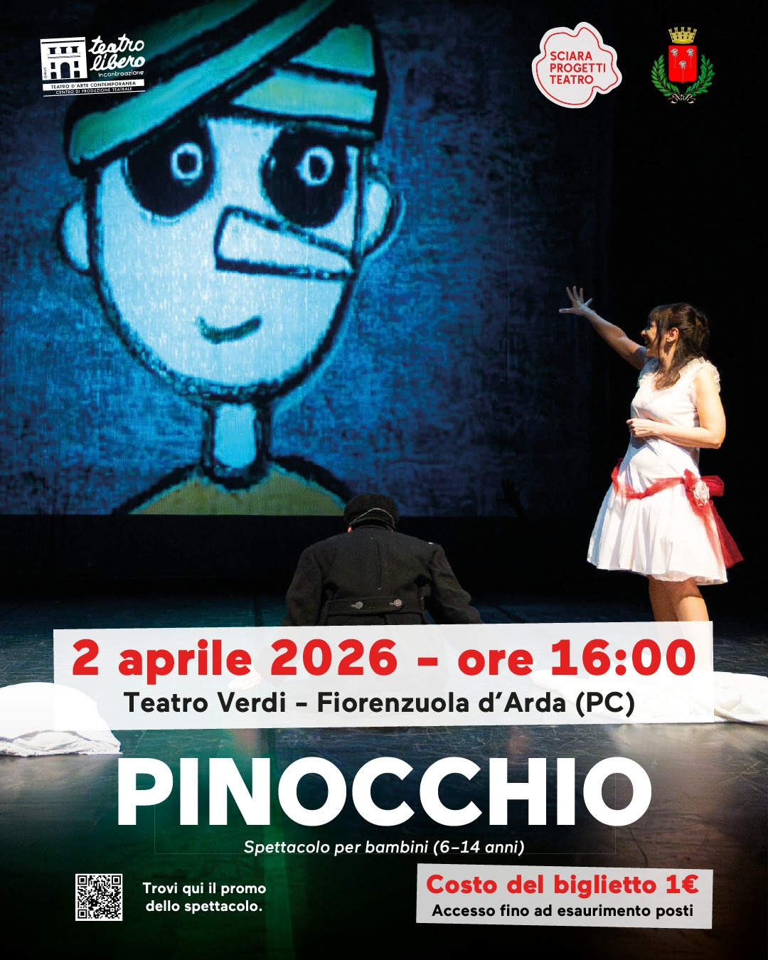 Giovedì 2 aprile, alle ore 16.00, il Teatro Verdi di Fiorenzuola d’Arda ospita "Pinocchio", uno spettacolo dedicato ai bambini dai 6 ai 14 anni.