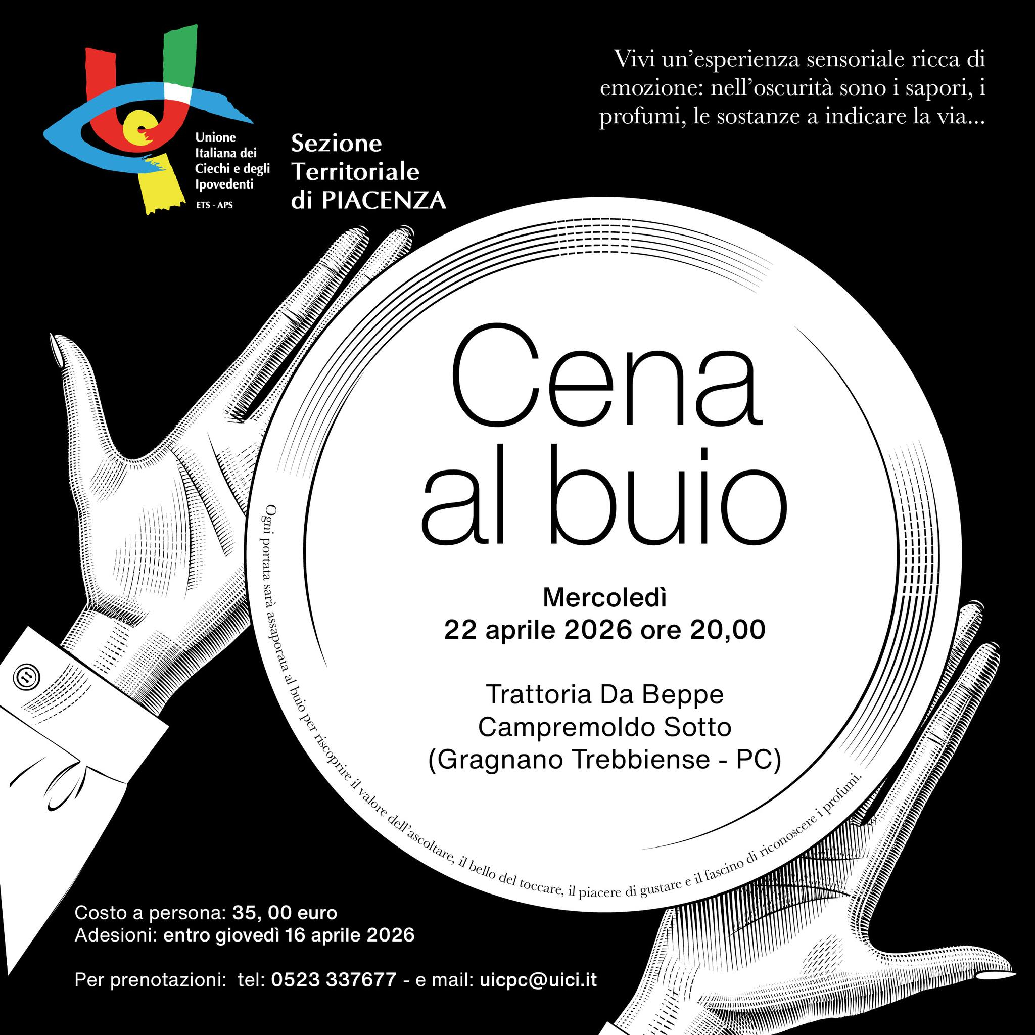 Mercoledì 22 aprile alle ore 20.00, alla Trattoria Da Beppe di Campremoldo Sotto, Gragnano Trebbiense, è in programma una Cena al buio promossa dall’Unione Italiana dei Ciechi e degli Ipovedenti – Sezione Territoriale di Piacenza.