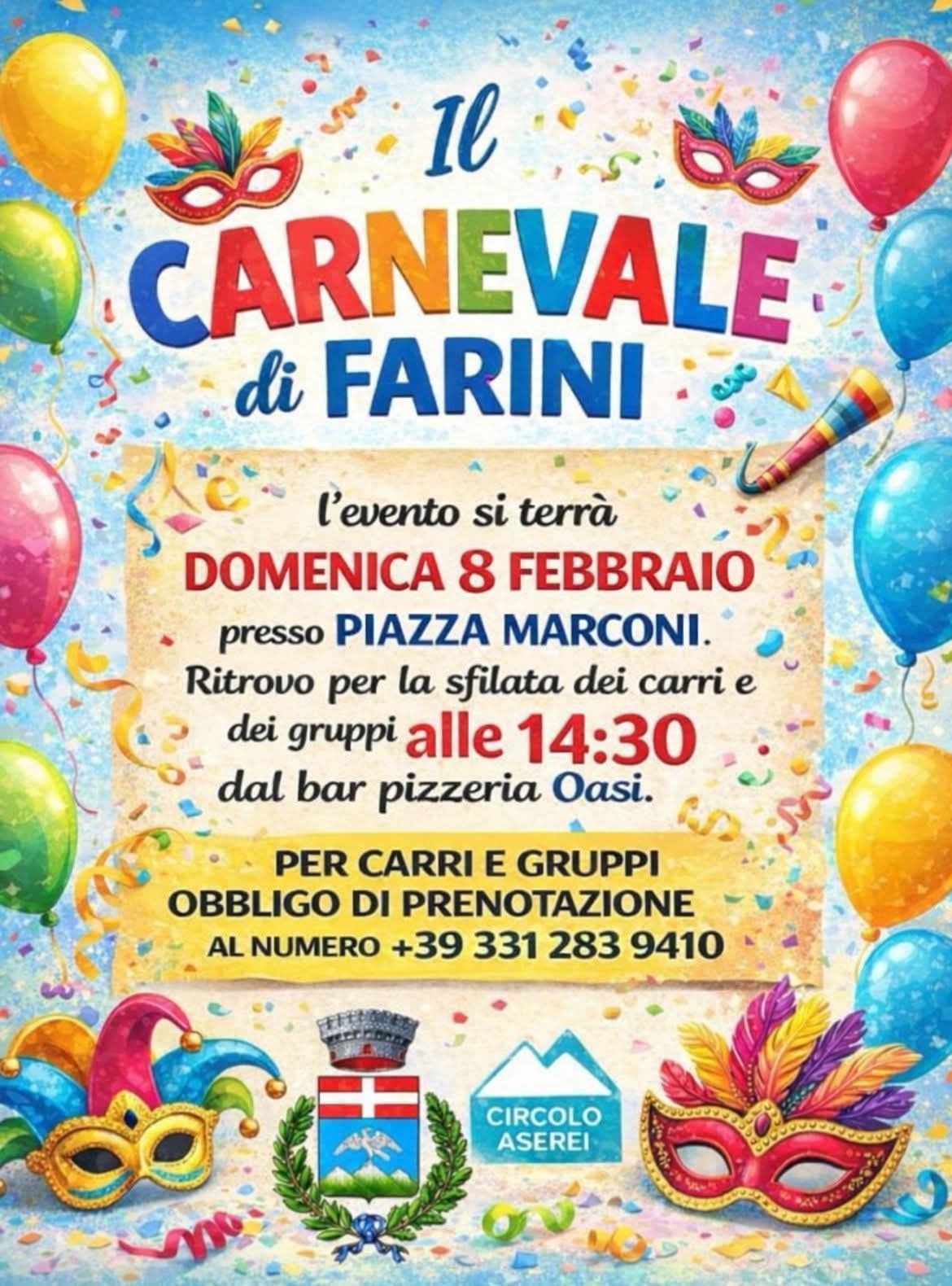 L’appuntamento è in piazza Marconi, con ritrovo alle ore 14.30 presso il bar pizzeria Oasi, da cui prenderà avvio la sfilata.