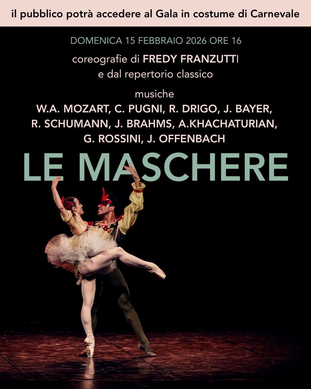 Per l’occasione, il pubblico è invitato ad assistere in costume di Carnevale, trasformando il teatro in un vero e proprio tripudio di maschere.