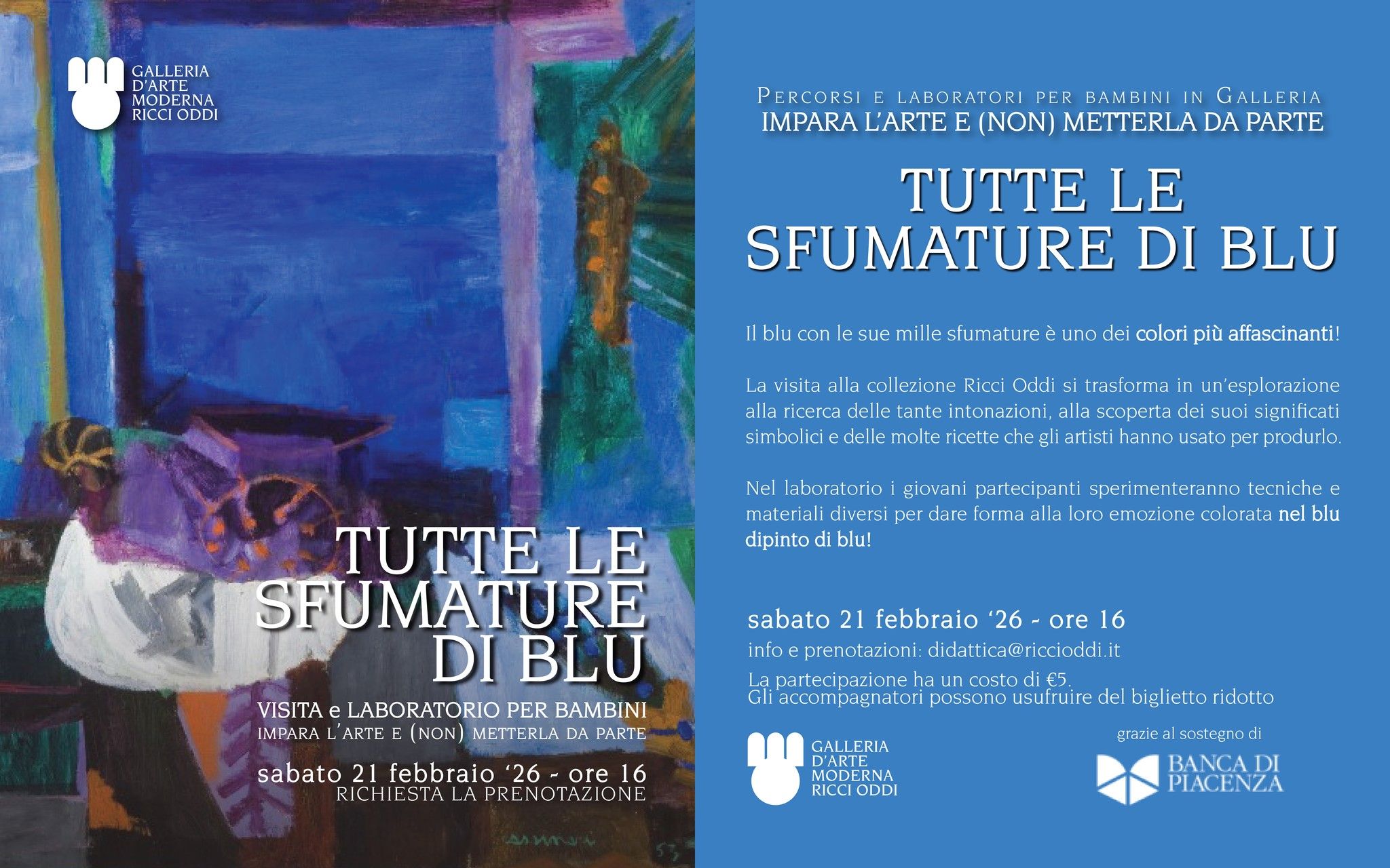 Sabato 21 febbraio alle ore 16.00 alla Galleria d’Arte Moderna Ricci Oddi si terrà "Tutte le sfumature di blu", visita e laboratorio per bambini nell’ambito del percorso Impara l’arte e (non) metterla da parte.