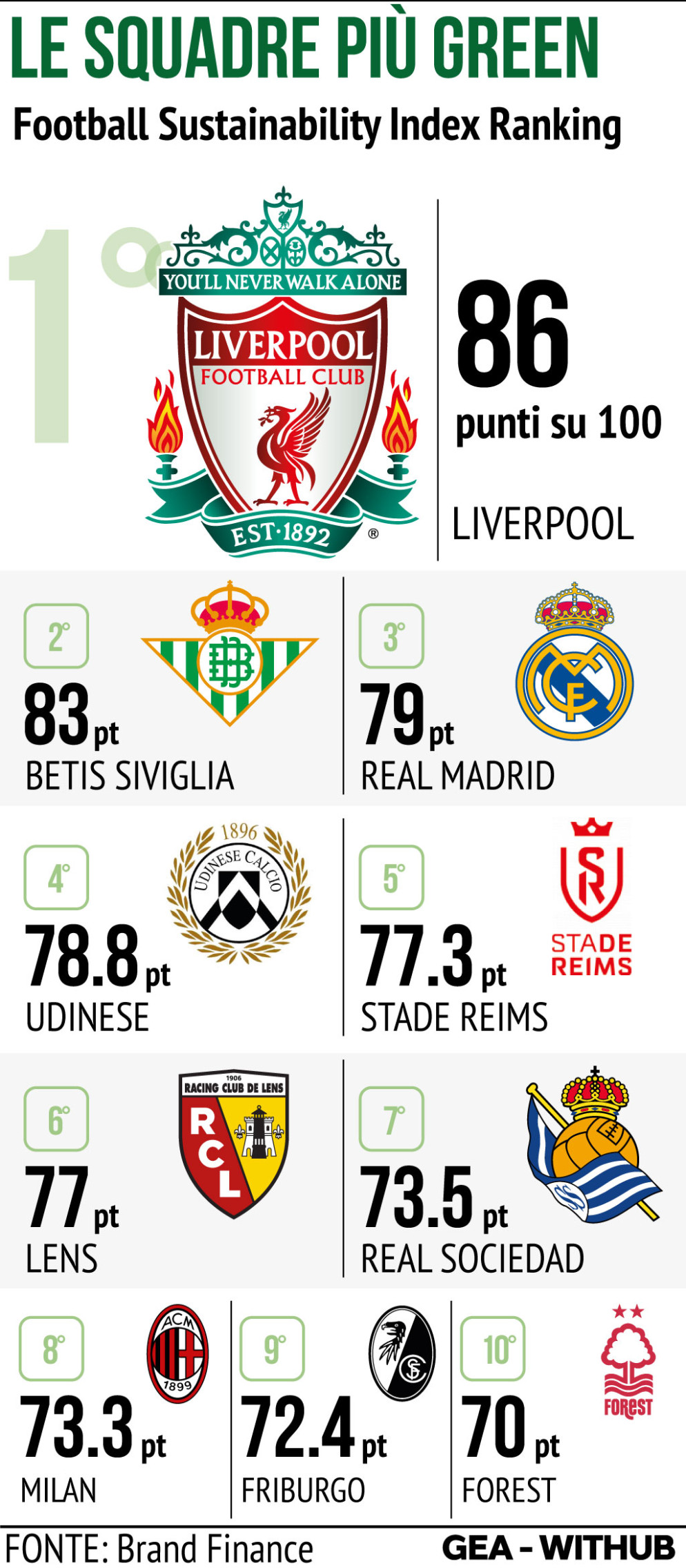 Il campionato più sostenibile è la Premier inglese, dove appunto svetta il team guidato da Jurgen Klopp. Il Liverpool ha ottenuto un punteggio complessivo di 86/100 in tutte e tre le metriche chiave di sostenibilità, cioè ambiente, sociale e governance (Esg). Intanto la società si impegna in ampi progetti comunitari a supporto di circa 2.000 enti di beneficenza locali. Uno dei fiori all’occhiello è poi “The Red Way”, piattaforma che comprende una strategia globale di formazione e sviluppo per tutti i dipendenti del club. Il Liverpool si è poi assicurato che siano carbon neutral tutte le sue attività dirette, con l’obiettivo di arrivare a zero emissioni.