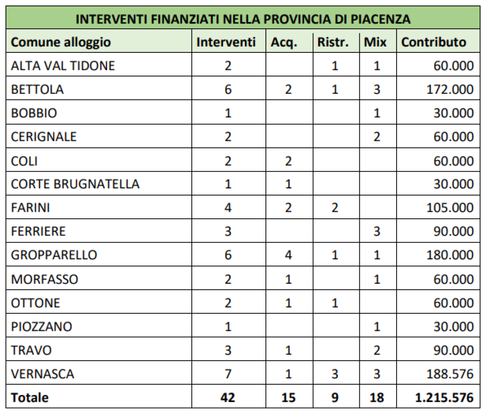 Andare a vivere in Appennino? La Regione rilancia e raddoppia, dando questa opportunità ad altre 346 giovani coppie o famiglie che si aggiungono alle prime 341 che si erano già aggiudicate il contributo nella prima graduatoria del “Bando Montagna”. Su 346 interventi, 26 sono quelli che riguardano i comuni montani della provincia di Piacenza per un importo complessivo dei contributi di 770mila euro; considerando anche la prima tranche di interventi, su 687 interventi complessivamente finanziati: 68 nuclei familiari ricevono il contributo in provincia di Piacenza, per un importo complessivo di 1.985.576 euro.