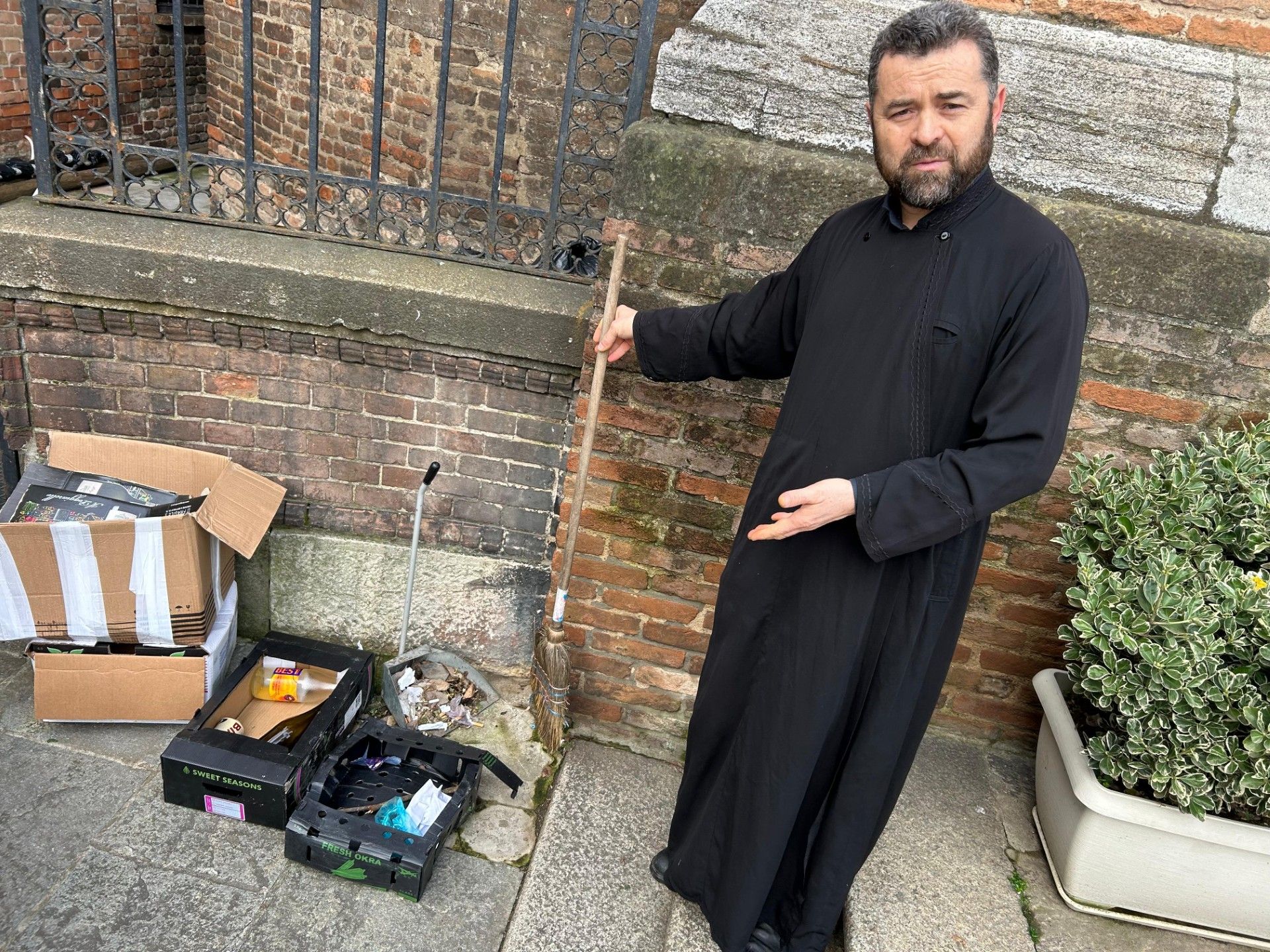 Il parroco Iuri Ursachi indica l’immondizia raccolta all’alba. «Non se ne può più, questo è ciò che abbiamo raccolto proprio stamattina», dice. Ma a pesare sono soprattutto i danni: contenitori delle piante spaccati, una colonna crepata, sampietrini sollevati. Nei giorni scorsi anche quattro o cinque mattoni delle pareti esterne sono stati rimossi e lanciati.