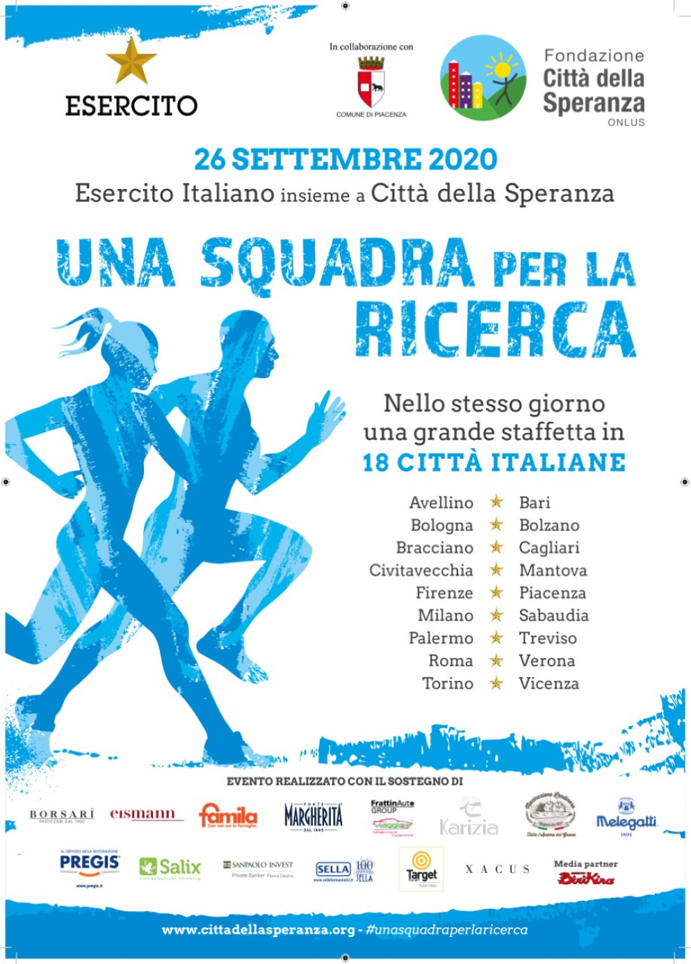 Con questi obiettivi, sabato 26 settembre si terrà la staffetta nazionale intitolata “Una squadra per la ricerca”, organizzata dal Comando Forze Operative Terrestri di Supporto dell’Esercito Italiano, con sede a Verona, ma che vedrà schierati circa 30 reggimenti da esso dipendenti in favore di Fondazione Città della Speranza Onlus impegnata a sostenere la ricerca pediatrica e la diagnostica avanzata delle malattie oncoematologiche, per tutti i bambini in Italia, nel più grande polo europeo dedicato a questo ambito: l’Istituto di Ricerca Pediatrica Città della Speranza.