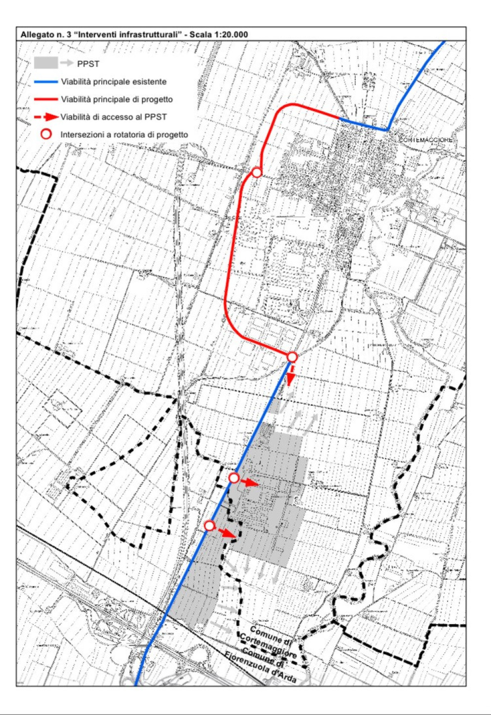Il progetto che porterà alla realizzazione di tre fabbricati produttivi e relative opere di urbanizzazione, prevede l’inserimento, lungo la strada provinciale della Val d’Arda, di due incroci a rotatoria: uno in territorio di Fiorenzuola, in ingresso alla nuova lottizzazione, ed uno in territorio di Cortemaggiore.