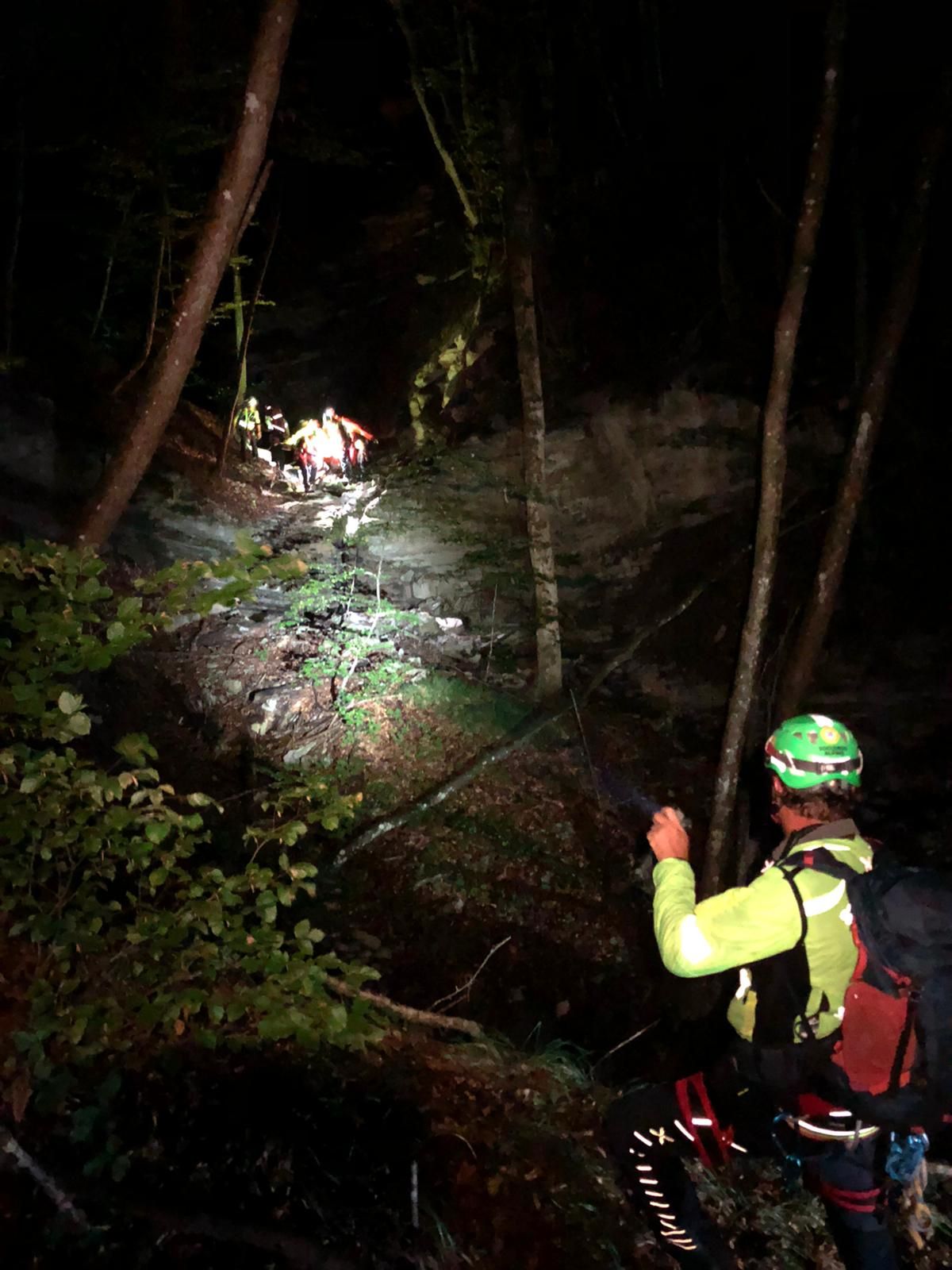 In base alla triangolazione di reti telefoniche su indirizzamento della centrale operativa 118 e del Soccorso Alpino Guardia di Finanza erano già stati messi in preallerta i droni dei Vigili del Fuoco, dotati della tecnologia IMSI CATCHER, e l’Aeronautica Militare 15º Stormo SAR di stanza a Cervia Pisignano. Fortunatamente non ce n'è stato bisogno perché verso le 23.30 il fungaiolo è stato ritrovato. Si trovava in una zona molto impervia, boschiva e con costoni rocciosi, e date le condizioni di salute si è reso necessario l'intervento dell'elisoccorso. Con l'ausilio dei vigili del fuoco è stato aperto un varco tra gli alberi e i rami per consentire le operazioni di recupero; intanto l'equipe sanitaria ha stabilizzato il ferito e il personale del soccorso alpino ha predisposto un sistema di funi a teleferica per far scendere la barella in uno spiazzo, dove è stata agganciata al verricello dell'eliambulanza. A quel punto il 45enne è stato trasportato in volo all'ospedale di Brescia.