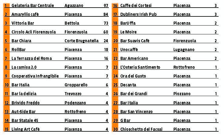 Ma oltre ai movimenti dei nostri campioni, abbiamo tre new entry che si guadagnano il proprio esordio in classifica: si arriva così a 30 pretendenti per la vittoria. I nuovi pretendenti sono L’Osteria Santimento, Decanta e Bar dei Grandi, rispettivamente di Rottofreno, Piacenza e Piozzano.