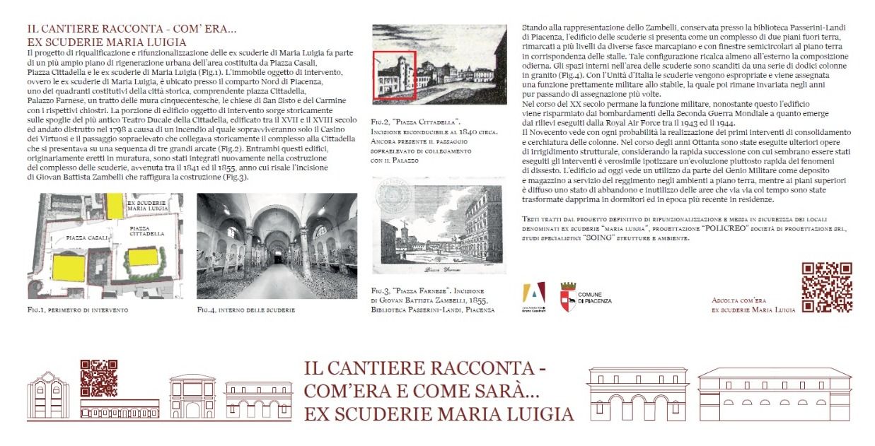 «Sono stati molto bravi, è un progetto complicato» dice il prof. Contengono notizie storiche e le immagini del progetto esecutivo delle ex Scuderie, oltre alla documentazione degli stadi iniziali dei lavori. Siamo nella scia delle iniziative “Il cantiere racconta - Come era e come sarà”, è un progetto ideato dall’assessorato all’Urbanistica, per il quale era presente l’assessora Adriana Fantini, affidato al Cassinari come percorso di competenze trasversali e di orientamento. Non è la prima realizzazione con queste finalità, per esempio si è attuato a Porta Borghetto e all’ex Laboratorio Pontieri.