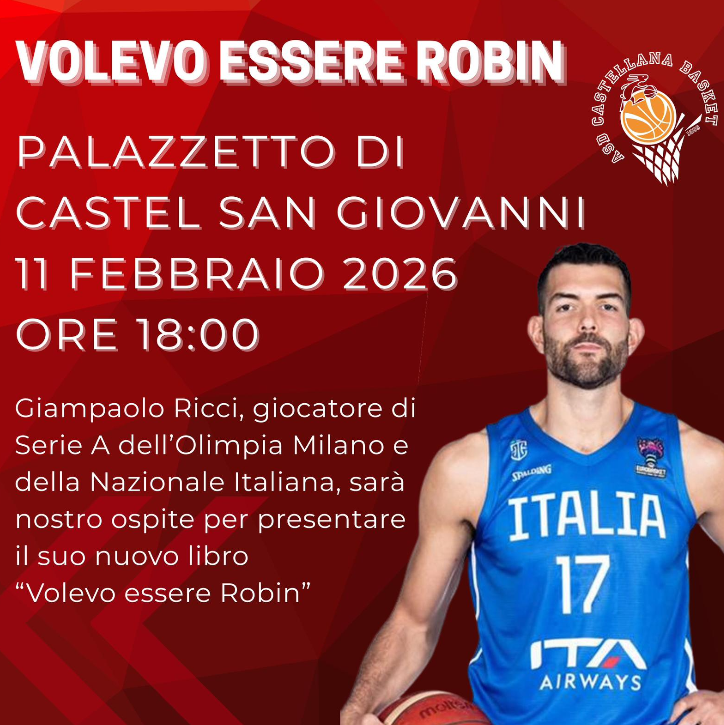 Questa sera, mercoledì 11 febbraio, alle 18 al Palazzetto dello sport di Castel San Giovanni un appuntamento imperdibile per gli appassionati di sport, storie di vita e motivazione: Giampaolo “Pippo” Ricci, capitano dell’Olimpia Milano e protagonista della Nazionale italiana di pallacanestro, presenterà il suo libro “Volevo essere Robin. Il mio viaggio fino a qui”, edito da De Agostini e già accolto con entusiasmo da tifosi e lettori.