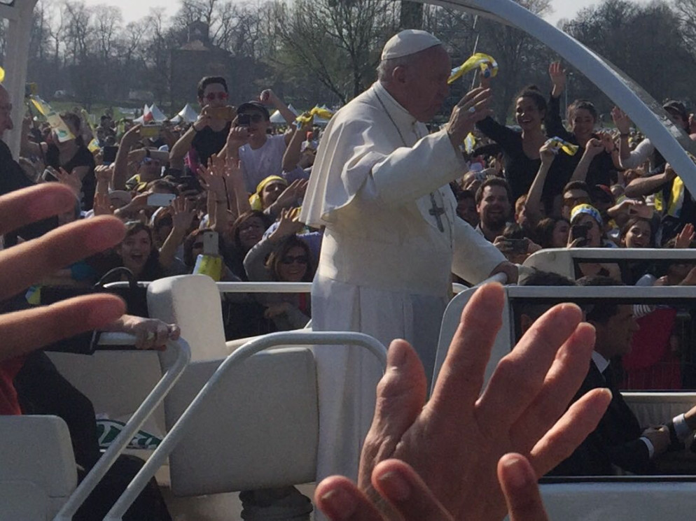 E’ stato a quel punto che, con grande sorpresa, i piacentini hanno potuto vedere passare al loro fianco il pontefice – come immortalato nella foto – mentre transitava a bordo dell’auto di servizio e, seduto a fianco del guidatore e con il finestrino abbassato, salutava i presenti.