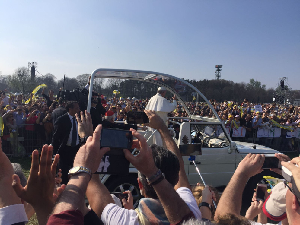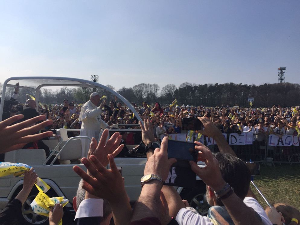Dopo aver assistito alla celebrazione eucaristica un gruppo di fedeli, partito da Caorso, stava facendo ritorno al pullman camminando lungo un viale dell’area verde quando all’improvviso si è sparsa una voce: “Passa il Papa!”.