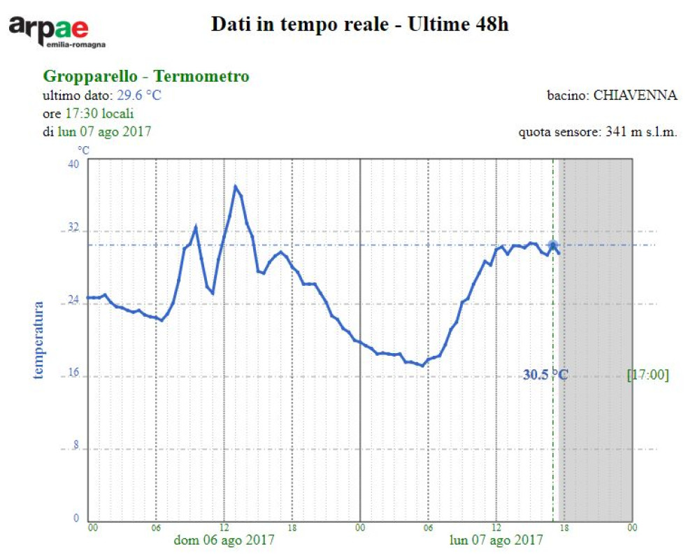 Verso il mezzogiorno di ieri a Gropparello si sono registrati 37 gradi, quasi 34 a Bobbio, 32 a Piacenza in una giornata ancora calda, ma che ha visto alternarsi momenti di annuvolamento a cielo sereno, fino a temporali sparsi, grazie ai quali nel pomeriggio le temperature sono drasticamente calate – dieci gradi in meno a Gropparello nel giro di due ore – per poi risalire e ondeggiare attorno alla soglia dei 30.