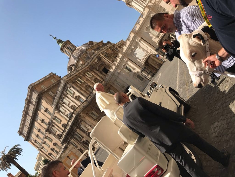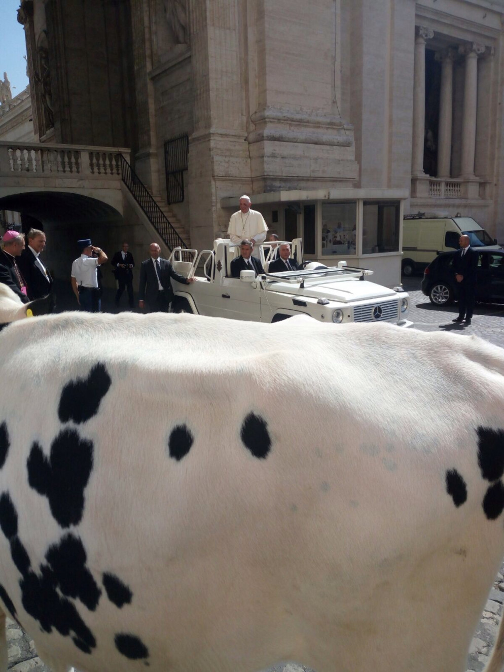 Lou, la vitella da latte di 380 chili nata un anno fa nell’azienda Gramigna di Saliceto di Cadeo, è arrivata nella sua nuova casa, nella villa pontificia a Castelgandolfo, accompagnata da 50 piacentini partiti da Roveleto di Cadeo. Alle 12.17 di mercoledì 13 settembre, è stata consegnata dall’allevatore Angelo Gramigna a Papa Francesco, al termine dell’udienza in piazza San Pietro.