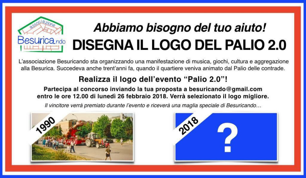 Il “Palio 2.0”, secondo le intenzioni, si svolgerà alla fine di giugno, sostenuto dal bando comunale “Giovani Progetti”. Il coinvolgimento, secondo gli organizzatori, inizia già da ora con l’invito a stimolare la creatività per realizzare il logo dell’evento, inviandolo entro il 26 febbraio 2018. Tutte le informazioni sono disponibili sulla pagina Facebook di Besuricando.