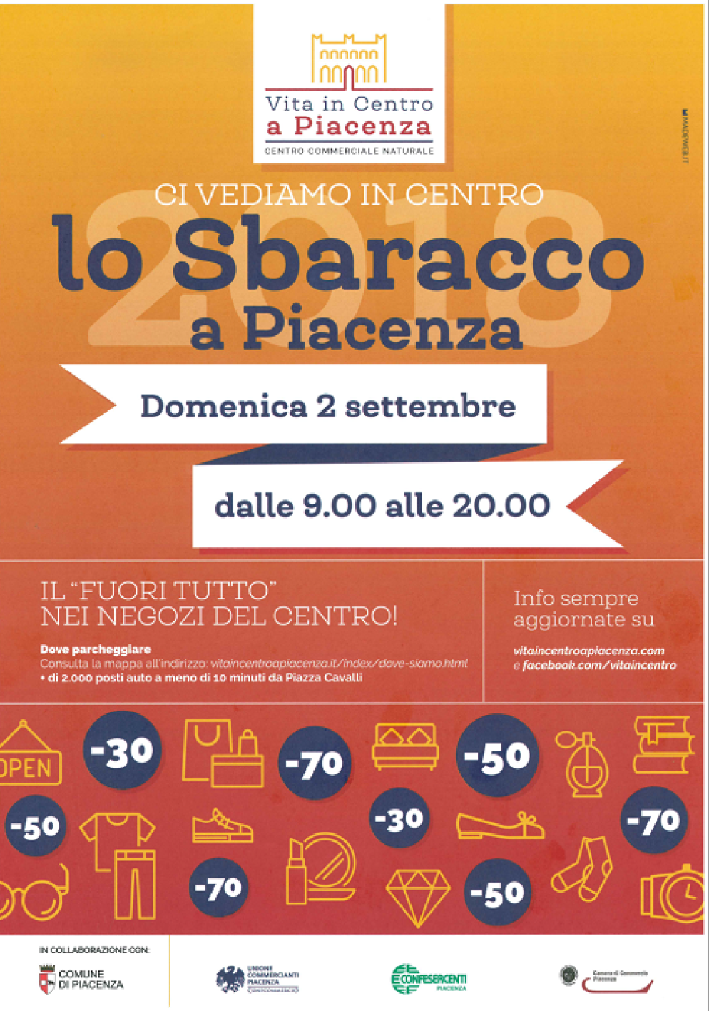 A chiusura dei saldi estivi 2018, oggi, 2 settembre, dalle 9 alle 20 i commercianti piacentini metteranno “fuori tutto”: lungo le strade del centro storico di Piacenza, negozi aperti ed esposizione in strada di capi, accessori, oggetti per l’ultima eccezionale svendita dell’anno con lo “Sbaracco”. In concomitanza si terrà anche il mercatino del riuso in via Roma.