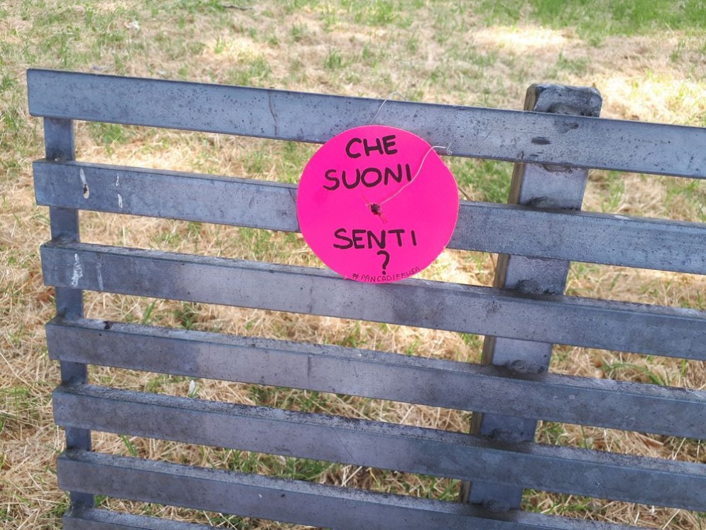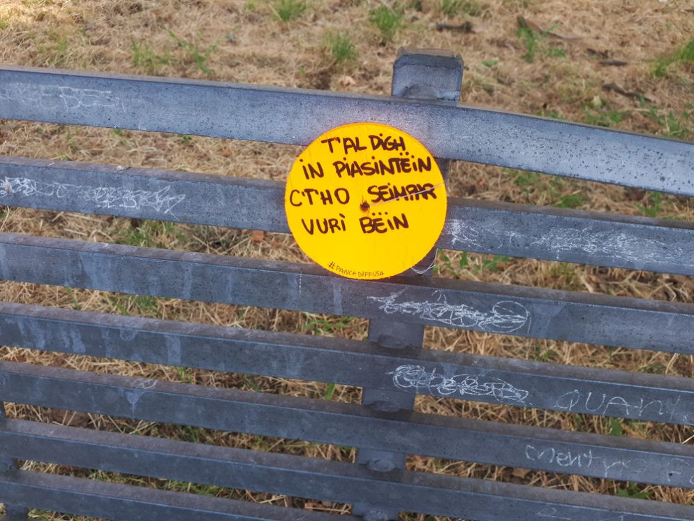Cartoncini colorati appesi alle panchine con un messaggio per i fruitori. I curiosi addobbi estivi sono comparsi nei giorni scorsi in via Maculani a Piacenza, un’area frequentata quotidianamente da persone di ogni età in cerca di un po’ di relax o impegnate in attività sportive. I cerchi dai colori sgargianti come il giallo o il fucsia hanno attirato l’attenzione dei visitatori. Uno dei messaggi ad esempio è: “Racconta un aneddoto divertente della tua vita al tuo vicino” e sembra un invito a socializzare nei tempi in cui le tastiere hanno sostituito l’approccio personale; “Che suoni senti” è un’altra delle scritte impresse sui cartoncini volta forse a focalizzare l’attenzione su ciò che ci circonda e poi, in giallo, un richiamo alla piacentinità con “T’al digh in piasintein, c’t’ho seimpar vurì bein”, popolare canzone di Gianna Casella divenuta anche inno del Piacenza Calcio. Le intenzioni degli autori si possono solo immaginare visto che, al momento, non si conoscono altre informazioni in merito all’iniziativa. Ogni disco colorato è firmato #pancadiffusa.