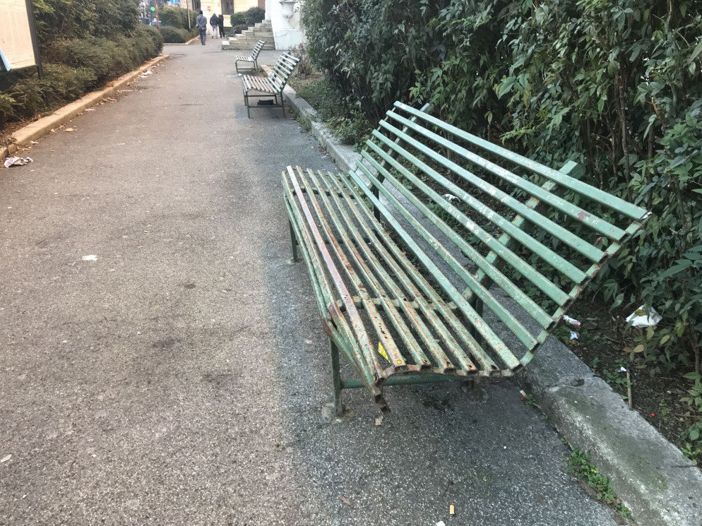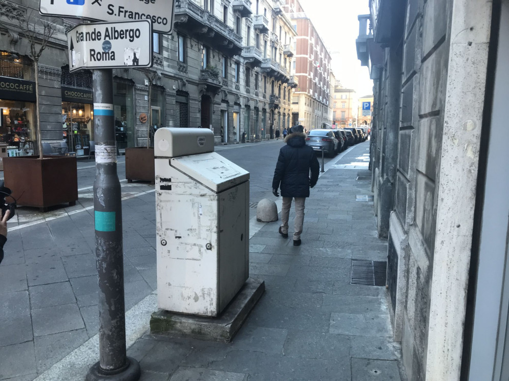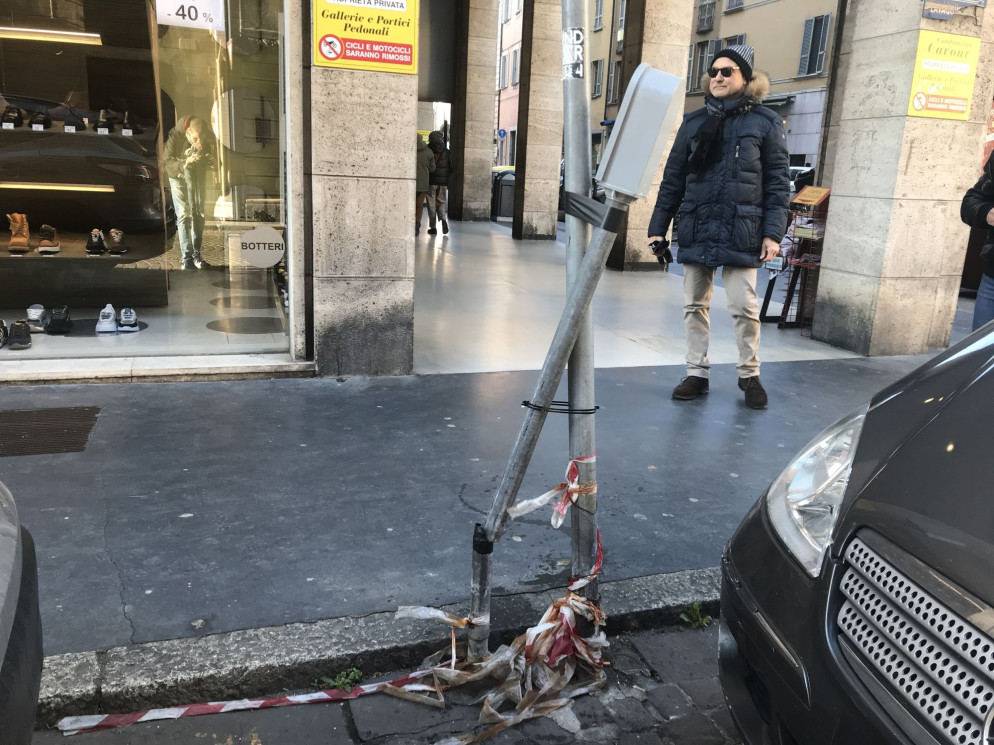 Si parte dall’angolo fra via Bacciocchi e via Cavour, dove la siepe di fronte alla scuola Mazzini è piena di fazzoletti usati, bottiglie di alcol e confezioni di plastica gettate per terra. “Alcune panchine sono rovinate e arrugginite – dice Girardi -, mentre la centralina della corrente elettrica è ricoperta dalla colla di adesivi e manifesti abusivi. Un palo che segnala la sosta a pagamento è abbattuto e crollato nell’aiuola”. Proseguendo in via Cavour, all’altezza del civico 52, balzano all’occhio alcuni cartelli stradali di attività commerciali rotti e piegati, un palo scrostato e un’altra centralina rivestita di colla secca. Una decina di metri più avanti, Girardi si sofferma sulla “colonnina del parchimetro impataccata, che basterebbe ripulire con un po’ di attenzione per riportarla a una normalità decorosa”.