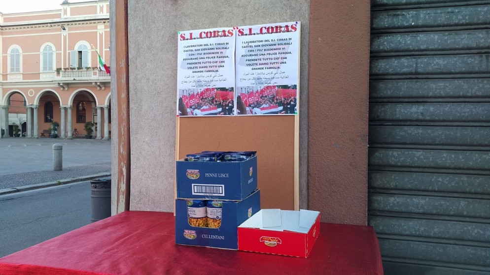 I commercianti di Castel San Giovanni e la parrocchia hanno allestito lungo corso Matteotti un banchetto dove chiunque dal lunedì al sabato dalle 9,30 alle 12,30 può donare generi di prima necessità per chi ne ha più bisogno. Anche i sindacati Sì Cobas hanno allestito, sempre lungo corso Matteotti, un banchetto solidale sopra cui hanno lasciato un cartello in cui invitano le persone bisognose a prendere secondo i loro bisogno. Sui banchetti si trovano pasta, riso, tonno, olio, colombe pasquali.