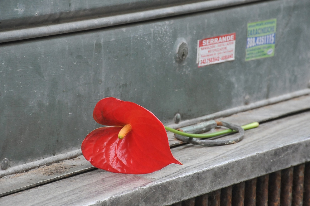 Un fiore rosso è stato lasciato sulla saracinesca del bar pasticceria Calamari di via Roma. Un omaggio al pasticcere Leonardo Dolcini, morto a 48 anni a causa del Coronavirus.