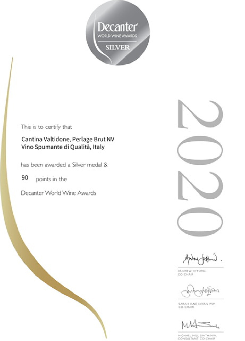 Il Dwwa (Decanter World Wine Awards), giunto alla sua 17° edizione, ha premiato con la medaglia d’argento lo spumante con metodo classico “Perlage Brut”, con un punteggio di 90/100. Medaglia di bronzo, invece, per il malvasia fermo “50 Vendemmie”, con un punteggio pari a 88/100. Al Bollo Rosso Gutturnio Riserva è andato invece il diploma di menzione “Commended”.