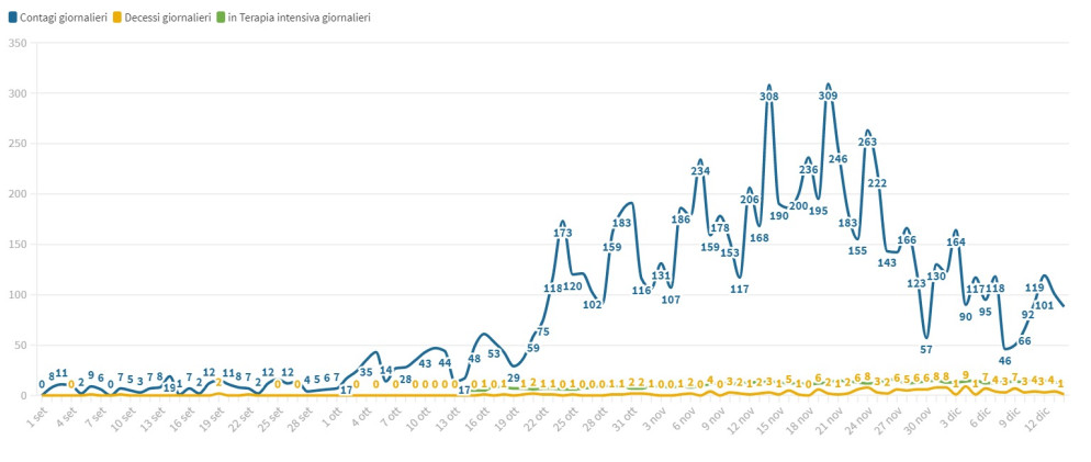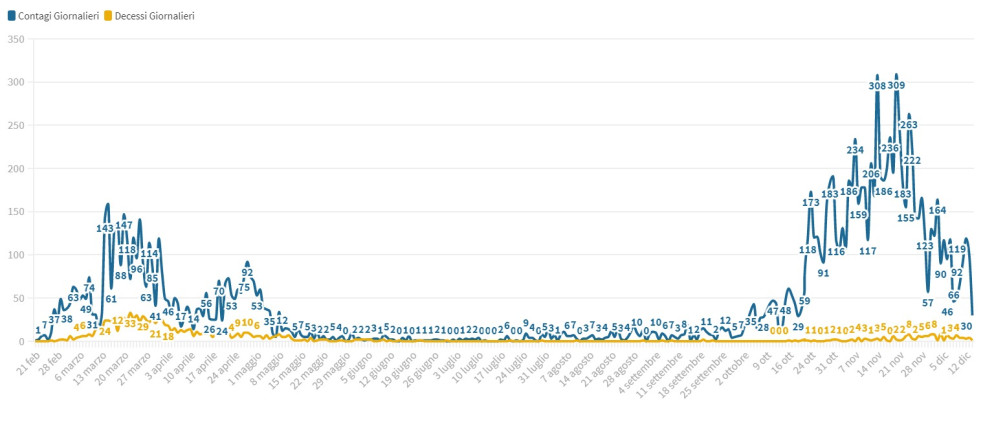Giornata di rallentamento per la pandemia da Coronavirus nel nostro territorio: oggi il bollettino sanitario indica 30 nuovi contagiati (di cui 18 sintomatici) e un solo decesso, quello di un uomo di 79 anni.