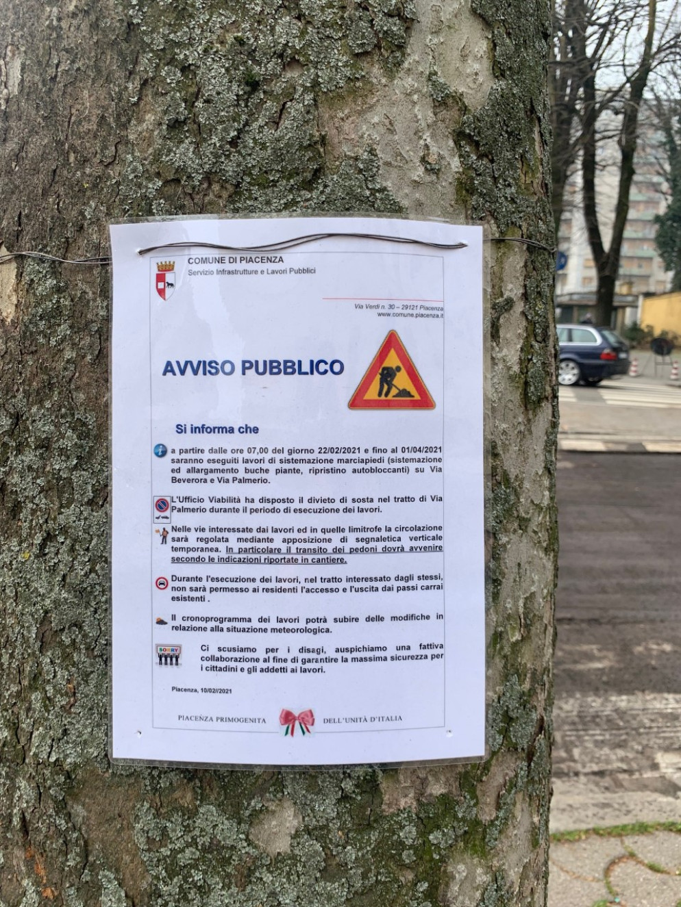 E’ iniziato questa mattina, lunedì 22 febbraio, l’intervento di riqualificazione della pavimentazione di viale Palmerio a Piacenza, nel tratto compreso fra la rotonda all’incrocio con piazzale Genova e Corso Vittorio Emanuele e quella con viale Beverora. Per consentire lo svolgimento dell’attività sono istituiti il senso unico di marcia con direzione da via Beverora verso Corso Vittorio Emanuele, il limite massimo di velocità a 10 chilometri orari e il divieto di sosta con rimozione forzata nelle aree delimitate dalla segnaletica di cantiere. Oltre ai lavori di asfaltatura sono previsti anche interventi di riqualificazione dei marciapiedi e la piantumazione di nuovi alberi.