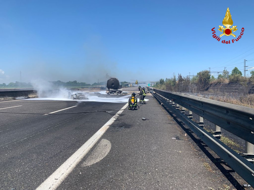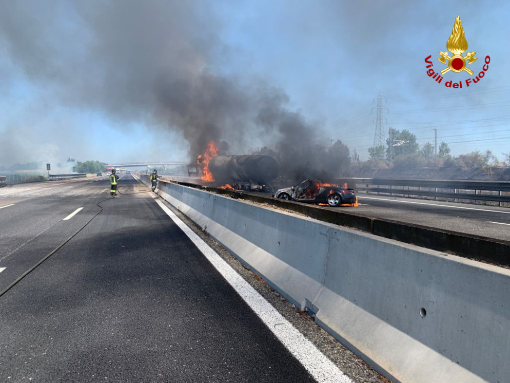 Per quanto riguarda la dinamica, secondo una prima ricostruzione pare che l’autotreno abbia tamponato l’autocisterna ferma in coda: in seguito all’impatto, davvero violentissimo, i due mezzi pesanti si sono incendiati.