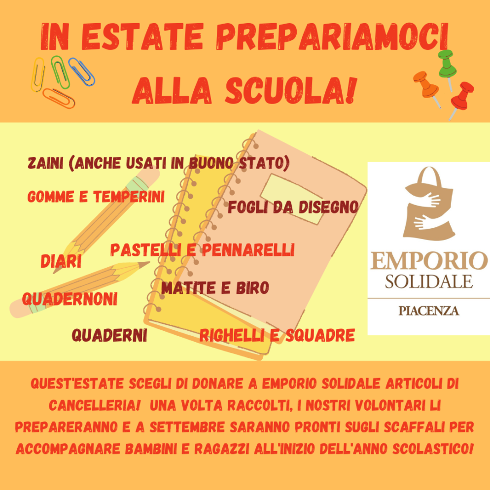 Biro, quaderni, matite, astucci, zaini, e non solo. L’emporio solidale in via Primo Maggio a Piacenza lancia un nuovo appello: la raccolta di materiale scolastico per le famiglie in difficoltà economica, in vista dell’ormai imminente ripresa delle lezioni. “I nostri ragazzi sono davvero tanti e vogliamo permettere a ciascuno di loro di prepararsi al meglio all’avvio dell’anno scolastico”, si legge nel messaggio diffuso dalla struttura sui social network. “L’inizio della scuola si sta avvicinando e grazie ai nostri affezionati sostenitori abbiamo raccolto tanti articoli di cancelleria, che da questa settimana andranno ad allestire il nostro scaffale dedicato agli studenti. Siete ancora in tempo per portarci altri prodotti”.