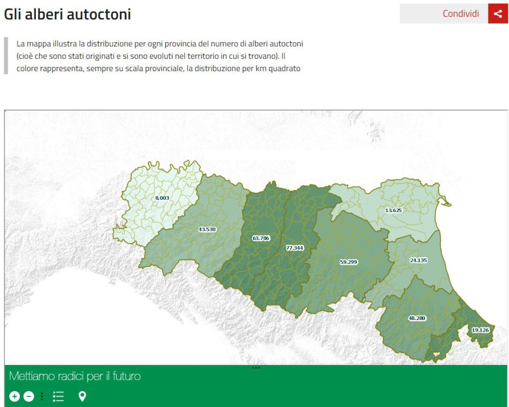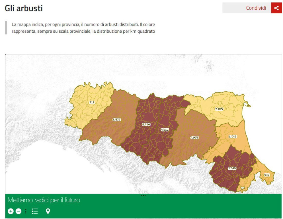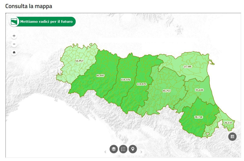 Una iniziativa che in sei mesi, da ottobre 2020 ad aprile 2021, ha permesso di mettere a dimora quasi 590mila, tra alberi autoctoni, alloctoni e arbusti nelle province del territorio regionale: 118mila nella provincia di Reggio Emilia, 109mila a Modena, 93mila a Bologna, 85mila a Parma, 26mila nella più piccola provincia romagnola, Rimini.