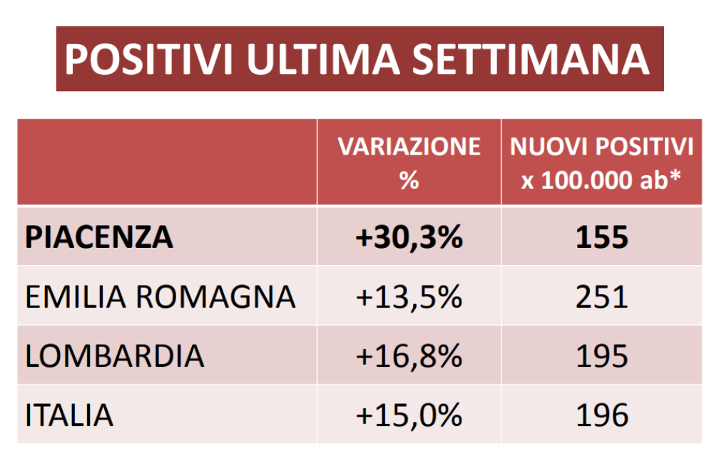 Dal 6 al 12 dicembre, i contagi da Covid, nella provincia di Piacenza, sono aumentati del 30,3%. Un vero e improvviso balzo rispetto all’Emilia Romagna (+13,5%), alla Lombardia (+16,8%) e all’Italia (+15%). I positivi sono stati 439 contro i 337 della settimana precedente. Il numero dei nuovi positivi è di 155 su 100mila abitanti a Piacenza, 251 in Emilia Romagna, 195 in Lombardia e 196 in Italia. Lo evidenzia il report dell’Ausl. Il report di questa settimana continua a indicare anche una chiara tendenza rispetto alle fasce d’età: si contagiano maggiormente bambini e ragazzi fino a 17 anni (301 casi su 100mila abitanti) e i giovani tra i 18 e i 40 anni (161 casi su 100mila abitanti).