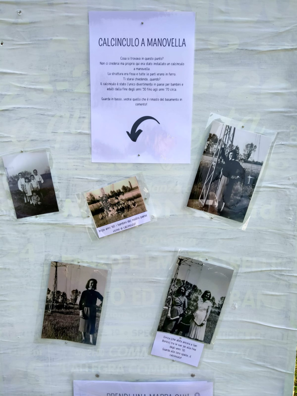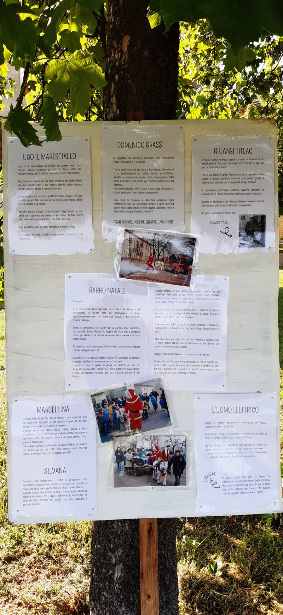 Sui pannelli è possibile conoscere dettagli relativi alle prime notizie sulla frazione, l’arrivo dei mongoli, la polveriera ma anche personaggi locali come il calzolaio e la sarta o curiosità come quella relativa all’elettricista che per evitare i furti dei premi del banco di beneficienza dormiva nella struttura.