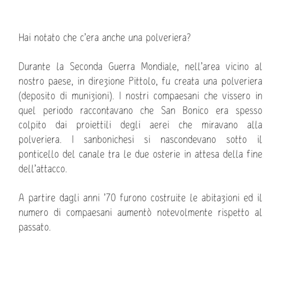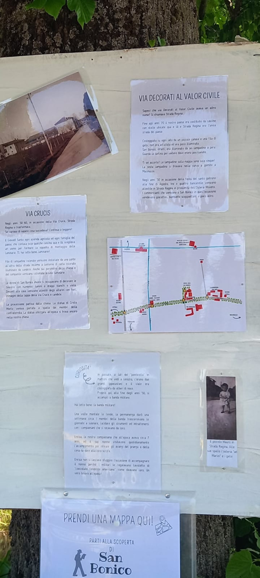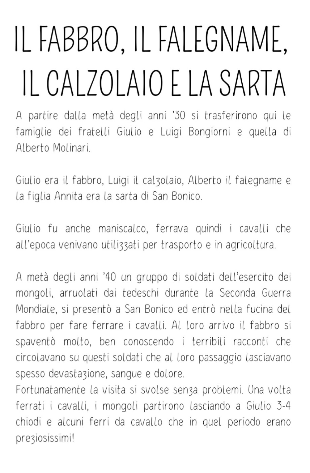 “I miei nonni e mio padre abitavano qui – spiega Elisa Bongiorni – e mi hanno raccontato aneddoti su personaggi e sulla storia del paese così, con Elena e Gaia, abbiamo deciso di approfondire a far conoscere a tutti le origini di San Bonico, in particolare ai nuovi abitanti sperando che possano frequentare attivamente il paese. Abbiamo messo una mappa nelle cassette della posta con l’itinerario e siamo contente perché abbiamo visto molte persone fermarsi a chiacchierare davanti ai cartelloni, è anche un modo per ritrovarsi e socializzare dopo la pandemia”.