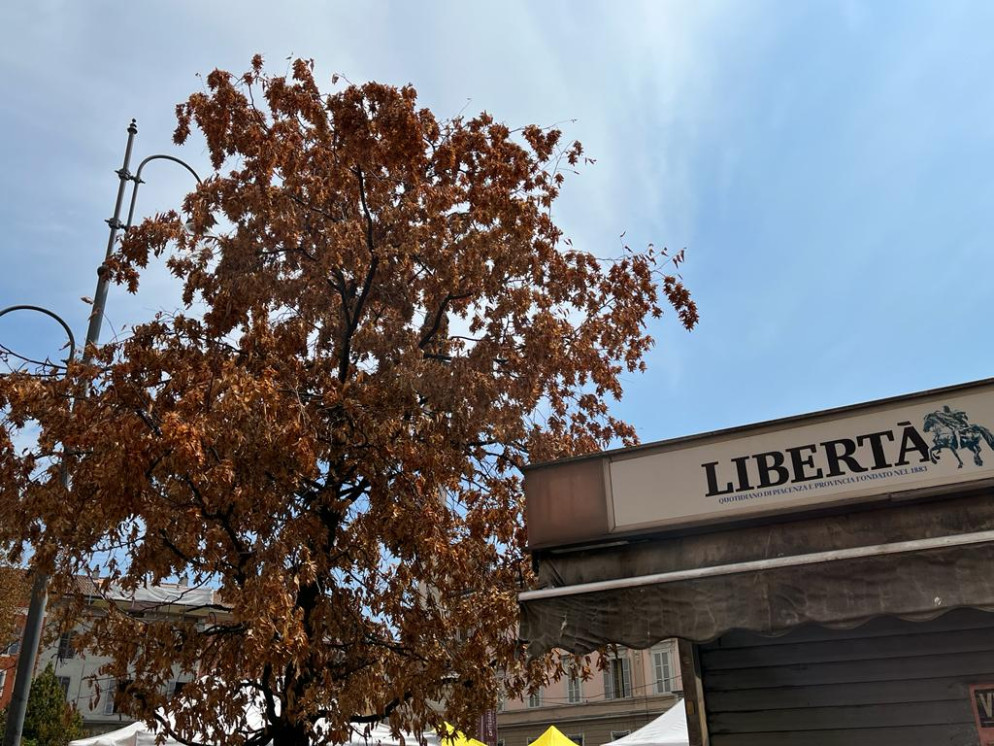 In piazza Duomo, a Piacenza, è arrivato l’autunno. Ma solo sulle chiome degli alberi che circondano la piazza. E che improvvisamente sono diventate dorate come accade in ottobre. Peccato che il calendario segni la fine di luglio. Le alte temperature delle ultime settimane non sembrano infatti avere risparmiato neppure il verde all’ombra – si fa per dire – della Cattedrale. Il Comune, contattato in proposito, ha garantito un’irrigazione di soccorso con la prospettiva di salvare il salvabile. Che per la cronaca è rappresentato da esemplari di carpini, ossia alberi autoctoni che solitamente vengono utilizzati a scopo ornamentale nelle piazze e nei viali e che fra l’altro dovrebbero autoregolarsi, ossia non avere bisogno di innaffiature. Tuttavia la chioma dorata e decisamente inusuale delle alberature ha messo in allarme diversi piacentini con il pollice più o meno verde che hanno segnalato la situazione: effettivamente non ci vuole un esperto per vedere che gli alberi si trovino in uno stato di sofferenza. La conferma arriva anche dall’assessore al verde Matteo Bongiorni: “Motivo della forte sofferenza è la poca terra a disposizione – spiega – in condizioni ottimali, come previsto dal Regolamento comunale, una pianta dovrebbe poter avere otto metri quadrati di terra a disposizione. Al problema della poca terra a disposizione si aggiunge anche l’aggravante della presenza della pavimentazione in pietra circostante. In sintesi la forte insolazione diurna, unita alle temperature elevate, produce un calore che accelera la disidratazione e il deperimento dell’essenza. E la straordinarietà di questa stagione è data dal fatto che negli scorsi anni non si è dovuto intervenire altrimenti”.