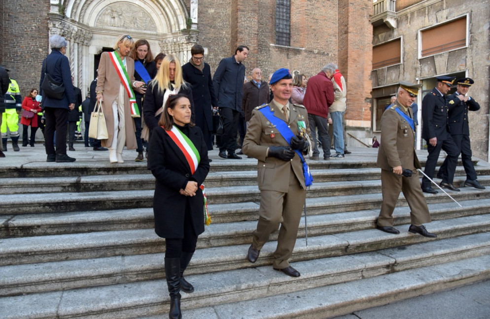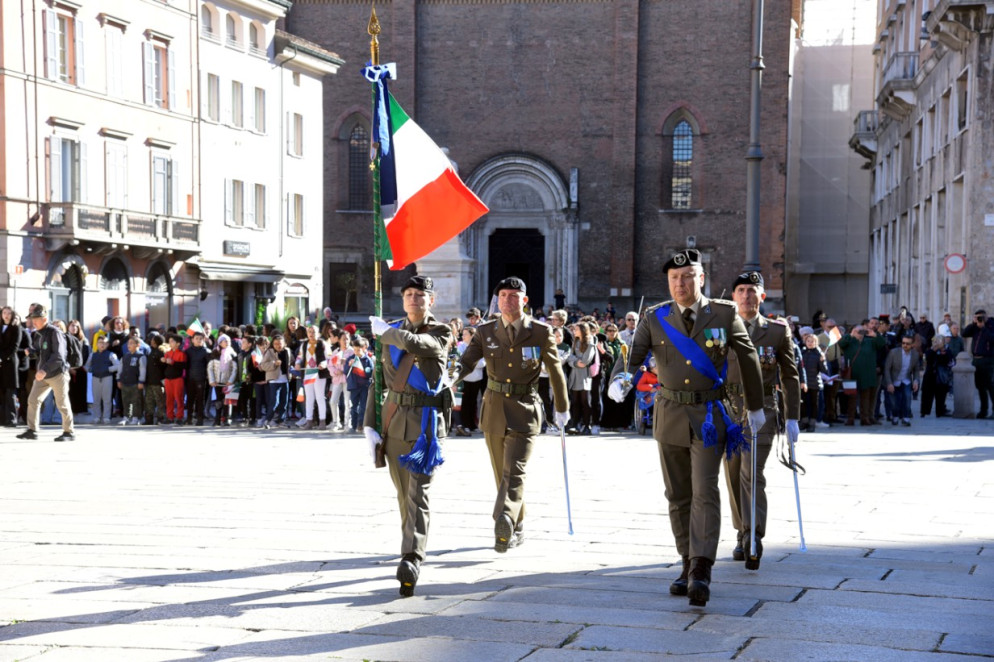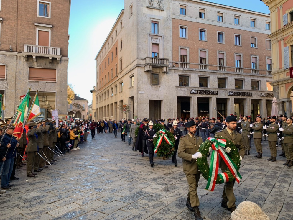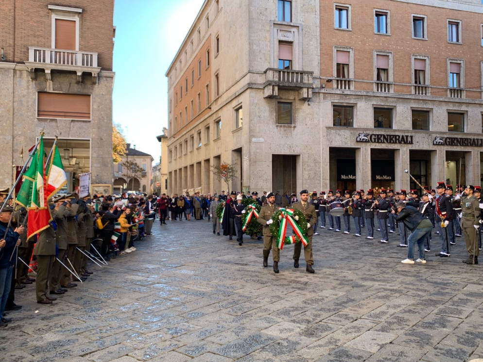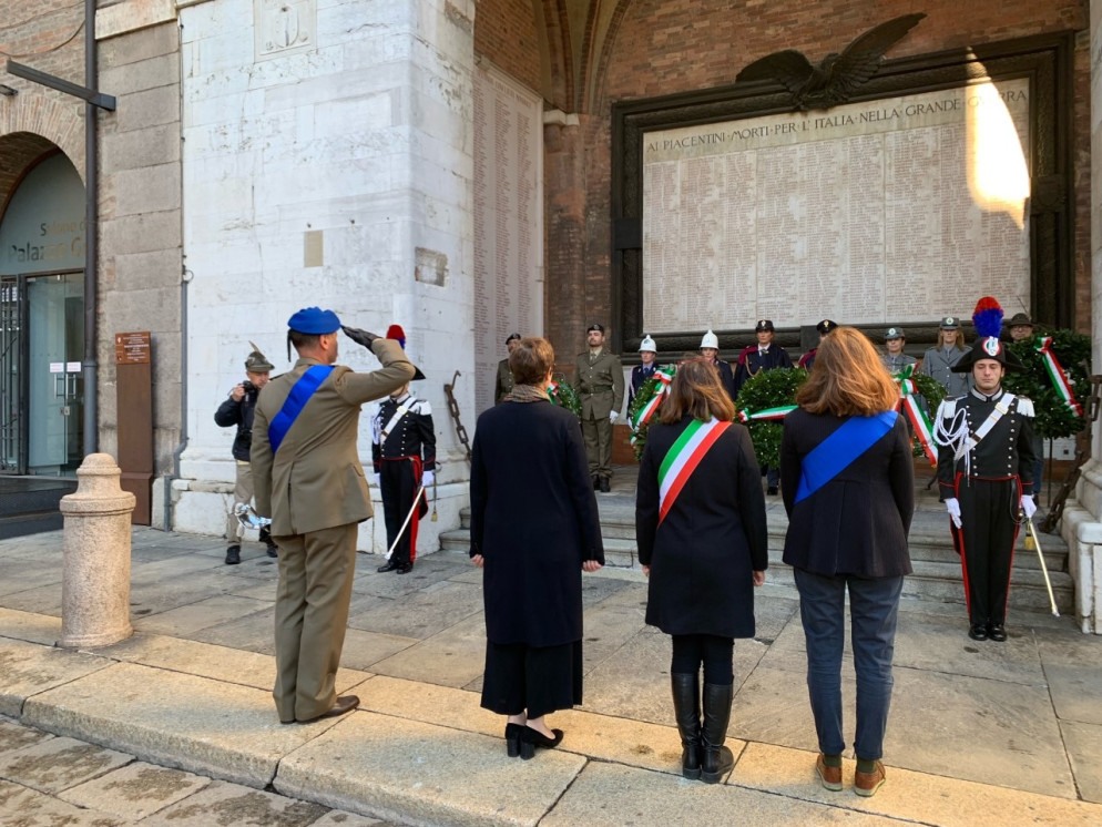 La celebrazione del 4 novembre è l’unica festa nazionale che abbia attraversato decenni di storia italiana, arrivando fino ad oggi. Come ogni anno anche Piacenza ha reso omaggio ai caduti, molti dei quali giovanissimi. Lo ha fatto come di consueto in piazzetta Mercanti, ai piedi del Comune. Sotto le arcate di Palazzo Gotico, il prefetto Daniela Lupo, la presidente della Provincia Monica Patelli, il sindaco Katia Tarasconi e il comandante del Polo di mantenimento pesante nord, il Brigadier Generale Daniele Durante, hanno deposto le corone al Sacrario dei Caduti.