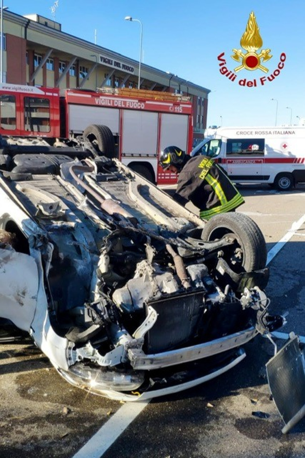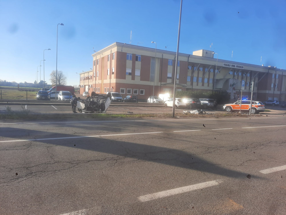 Auto esce di strada e si ribalta davanti alla caserma dei vigili del fuoco. Conducente ferito