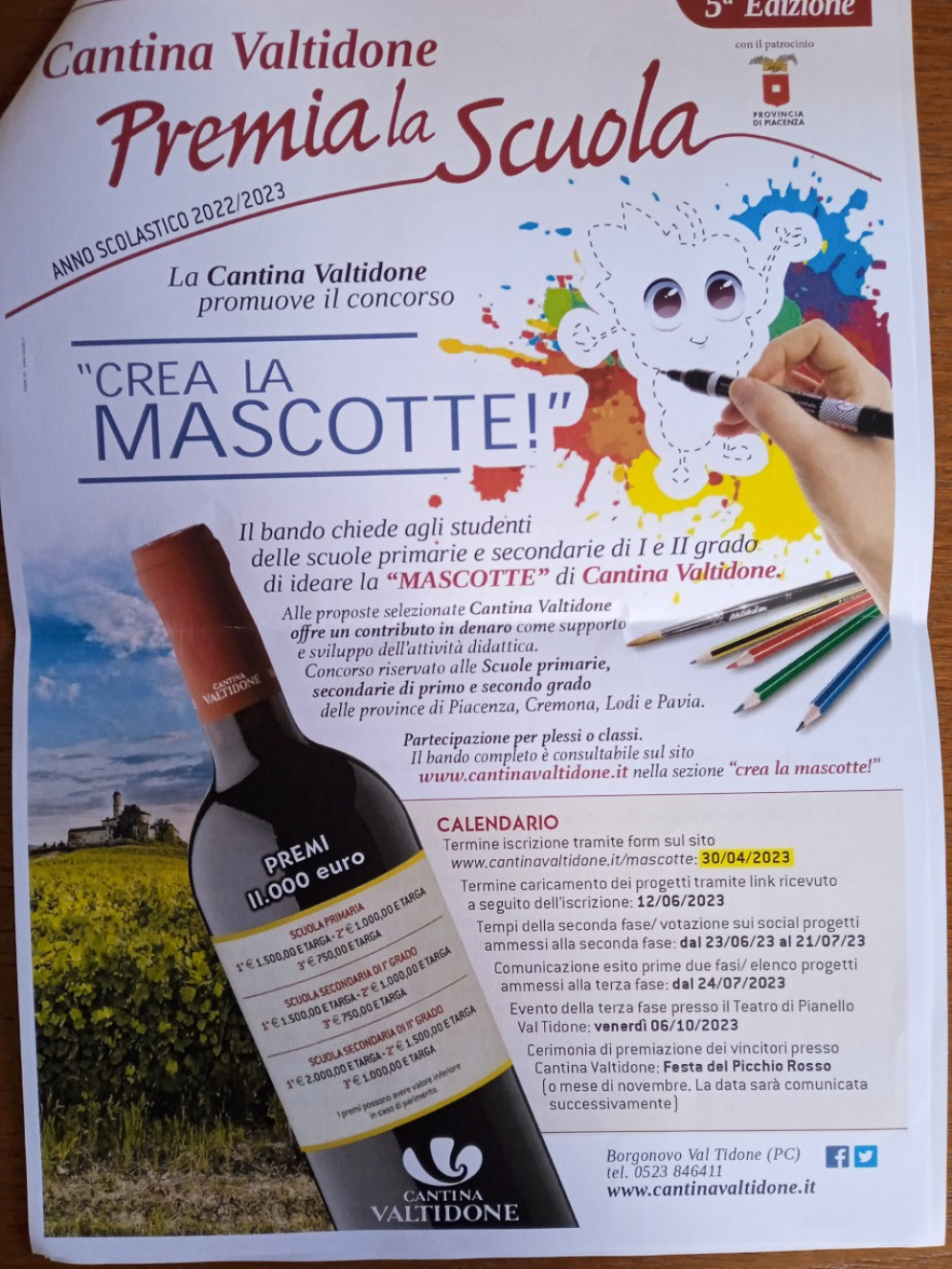 Ritorna, dopo tre anni di fermo, il concorso che Cantina Valtidone dedicata a tutte le scuole e tramite cui mette in palio ben 11mila euro. Ai partecipanti, scuole dalle elementari fino alle superiori, chiede di ideare una mascotte.