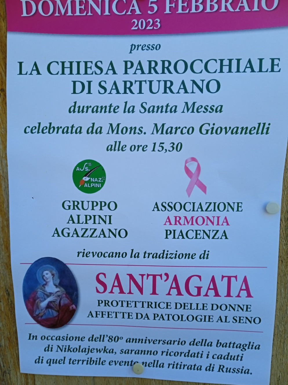 Domenica 5 febbraio gli alpini di Agazzano rinnovano il loro patto di amicizia con le donne di Armonia. Alle 15,30 nella chiesa di Sarturano monsignor Marco Giovanelli presiederà una messa durante in omaggio alla patrona delle donne affette da patologie al seno: Sant’Agata. Verranno ricordati anche i caduti della battaglia di Nikolajewka.